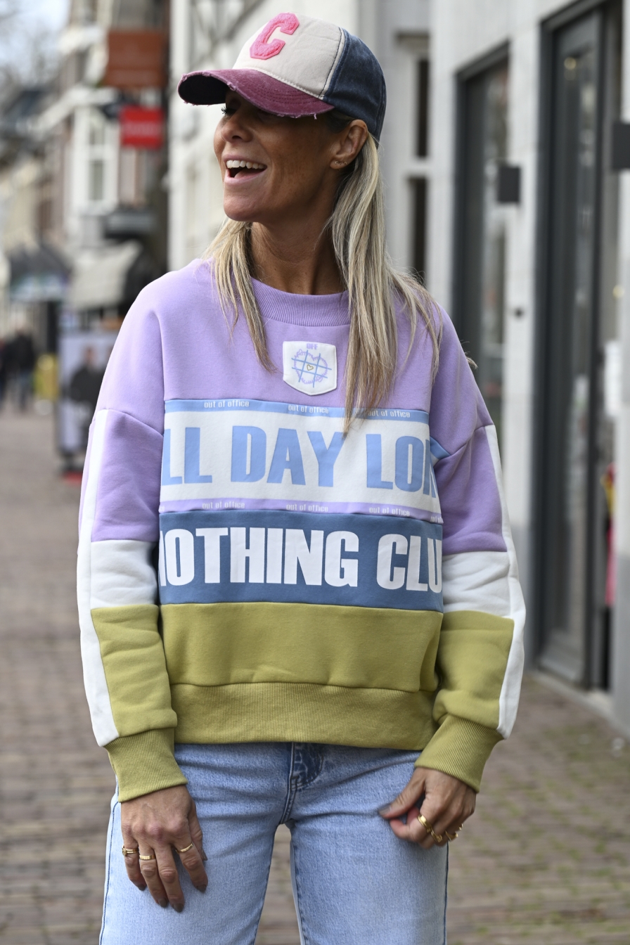 De kleurencombinatie in zachte pasteltinten maakt deze sweater helemaal af. Op de voorkant staat de tekst “ALL DAY LONG NOTHING CLUB”....