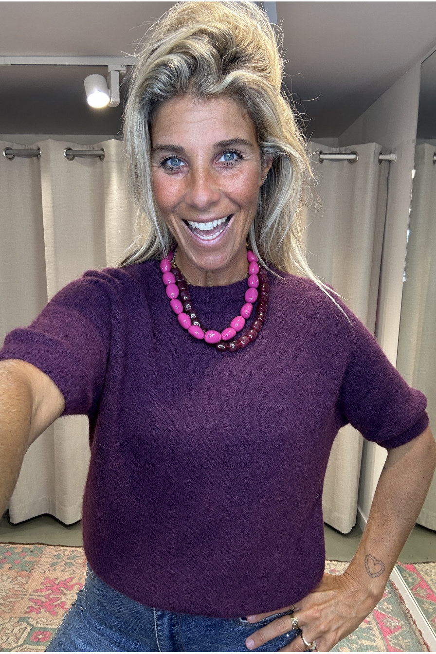 Trui Maxime is al jaren mijn favoriet! Dankzij 27% baby alpaca wol voelt hij superzacht aan en prikt niet. Dit one-size model met ronde kraag en korte mouwtjes draag je tot maat L/XL.