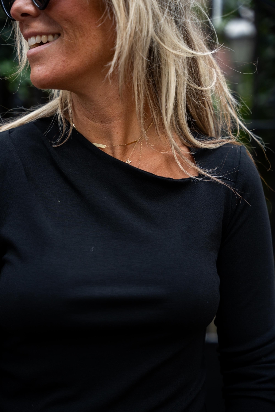 Goede basis truitje met een leuke asymmetrisch detail in de hals. Ik draag een maat S en ben 1.76.