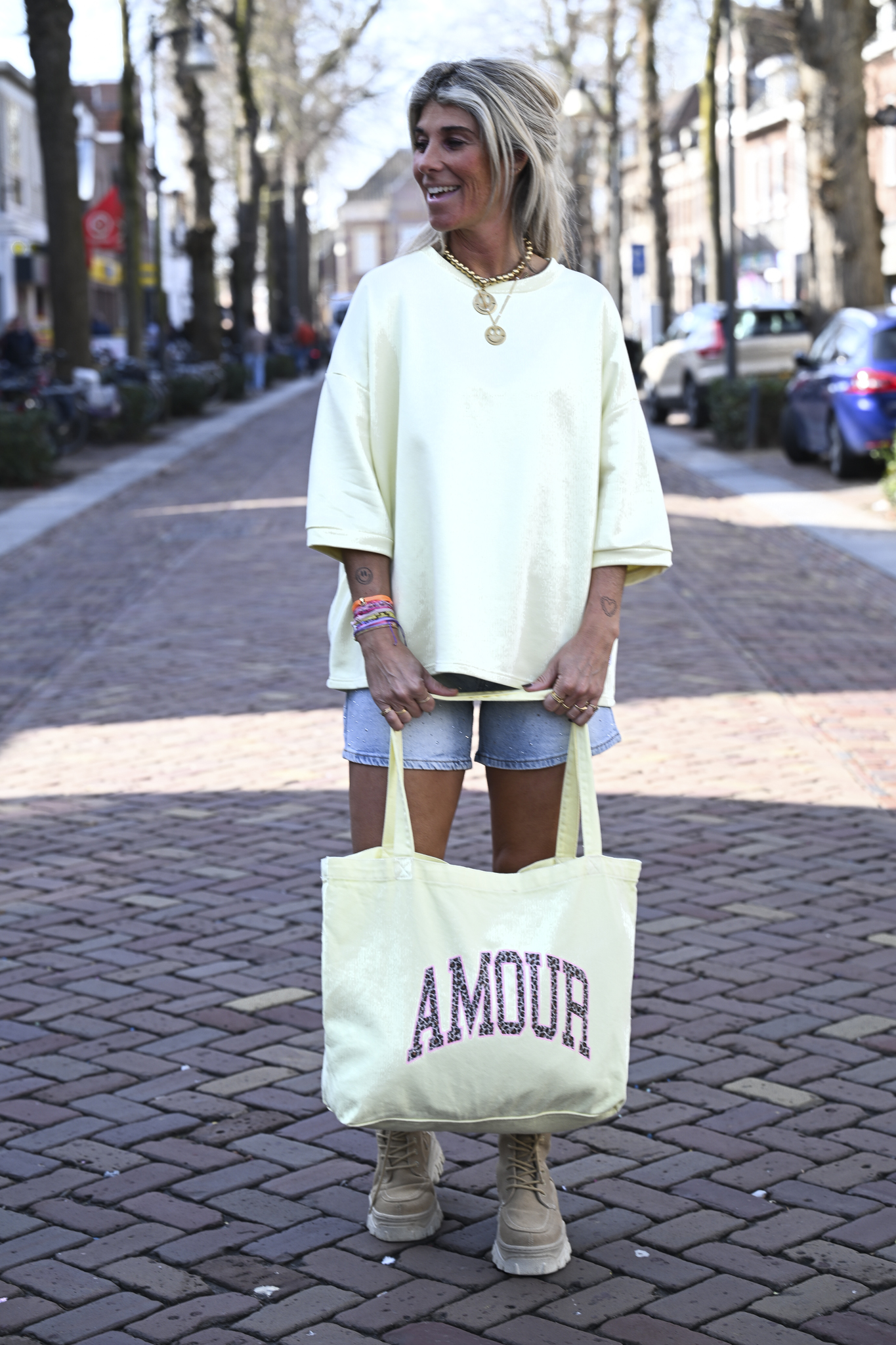 Heerlijke beachbag met twee hengsels in zachte kleuren en een gave leo-print met AMOUR detail. WE LOVE IT!
