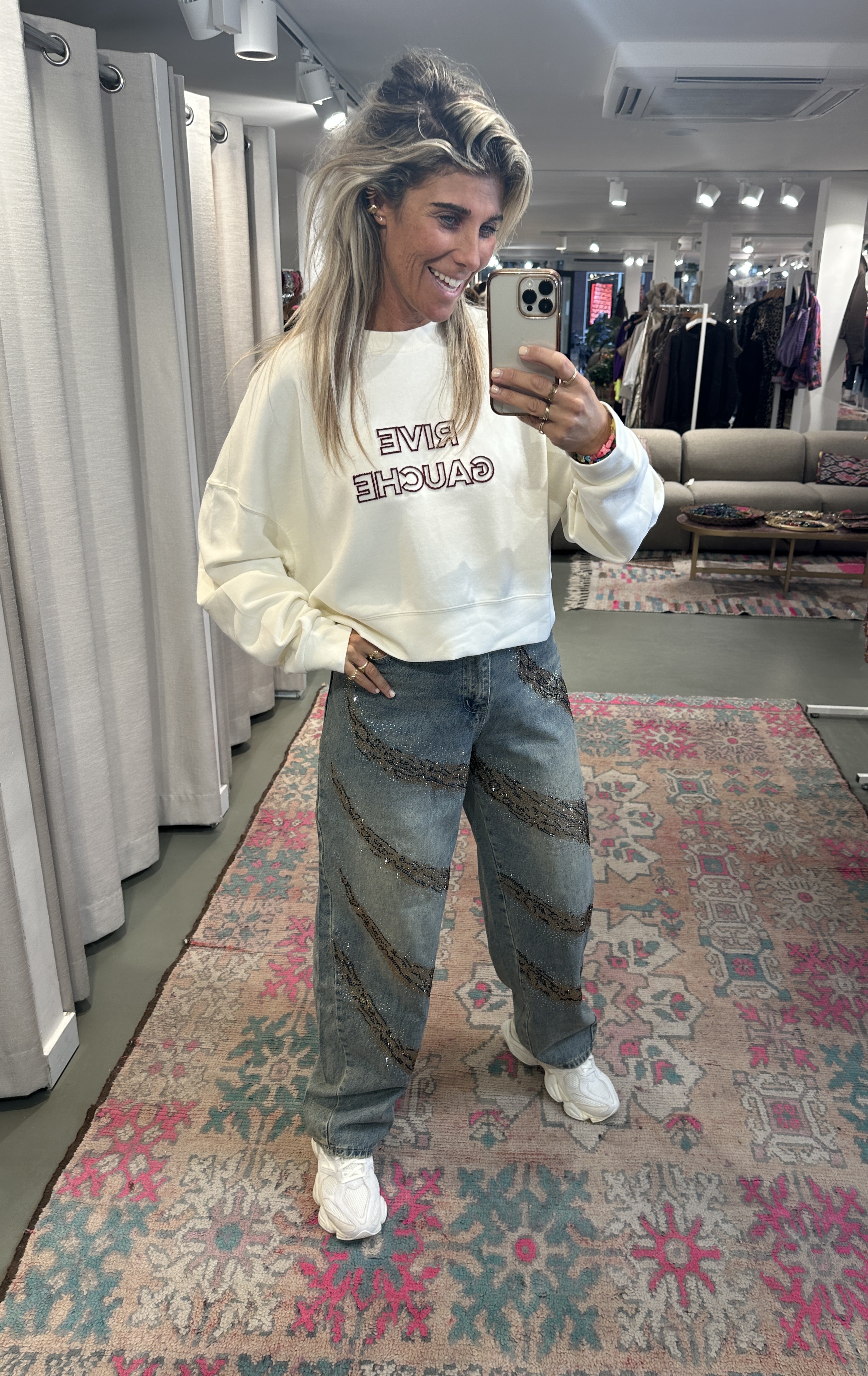 Echte balloon pasvorm! De jeans heeft vijf schuine strepen van pailletten en glitters in zwart en goud. Ik draag maat M op de foto...