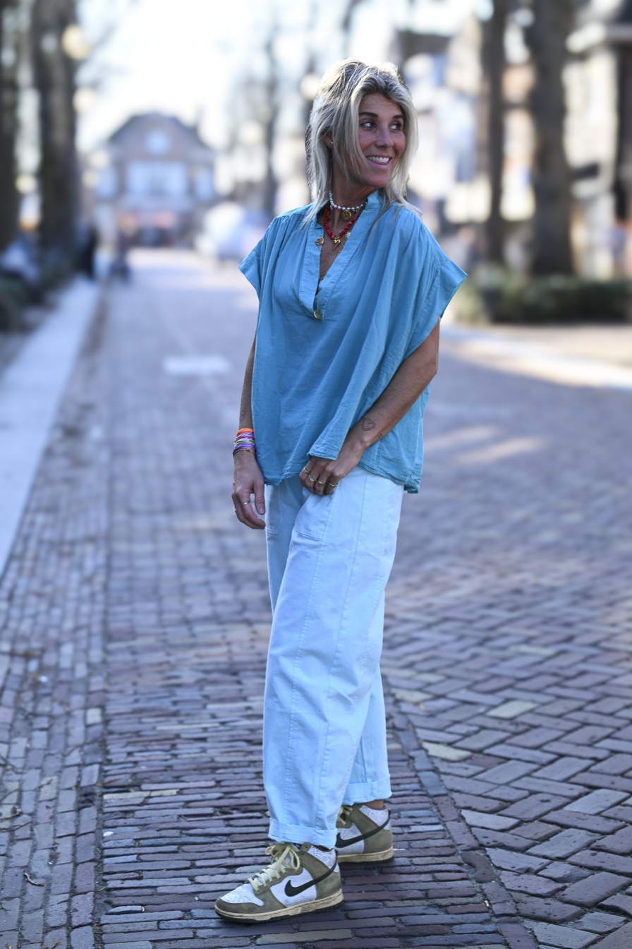100% barrel model, 100% katoen en een top fit. Deze gave turquoise barrel heeft diepe voorzakken en een extra elastische tailleband, waardoor je ’m moeiteloos draagt van maat S t/m XL. Het onesize model valt lekker baggy en ruim. Het model op de foto is 1.76 m.