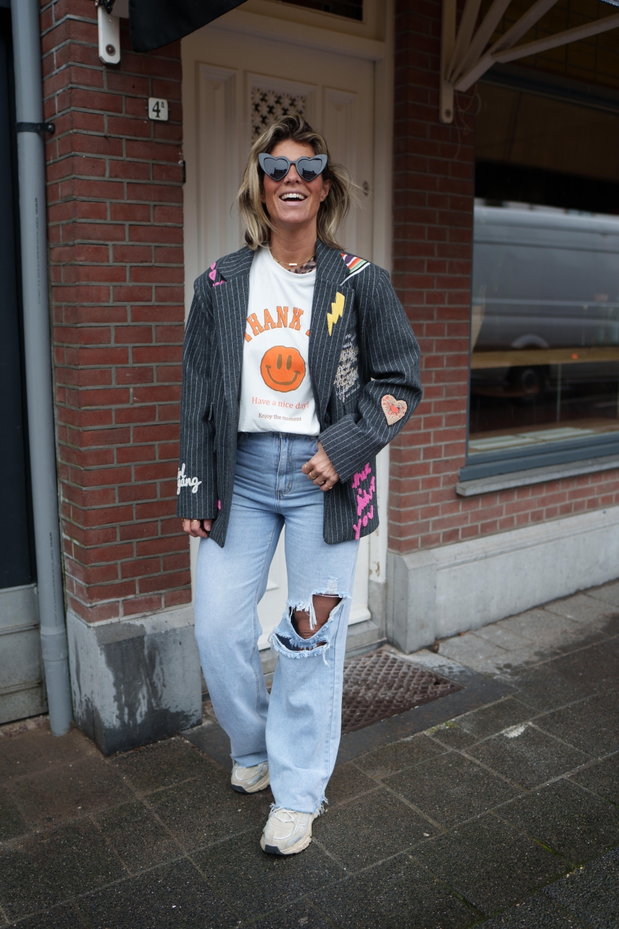 Opvallende donkergrijze blazer met funky applicaties voor een coole streetstyle look. Ik ben 1,76 en draag op de foto maat S!