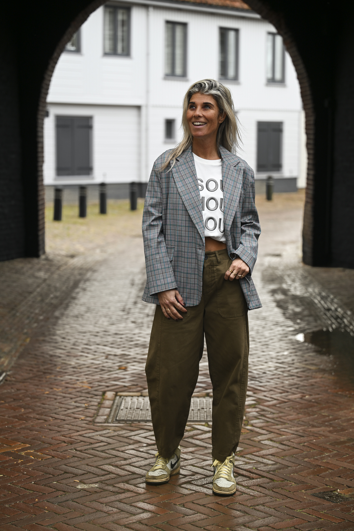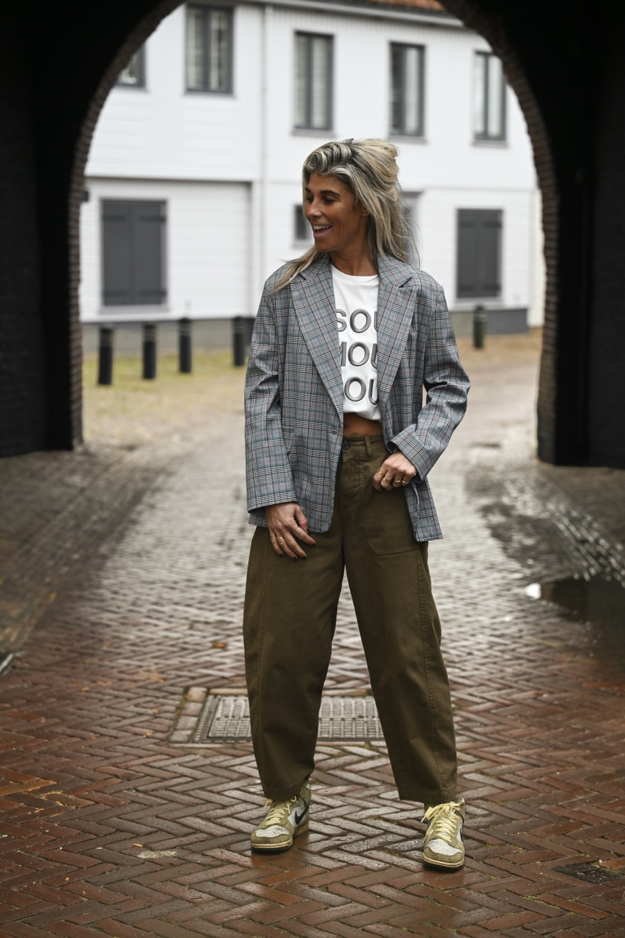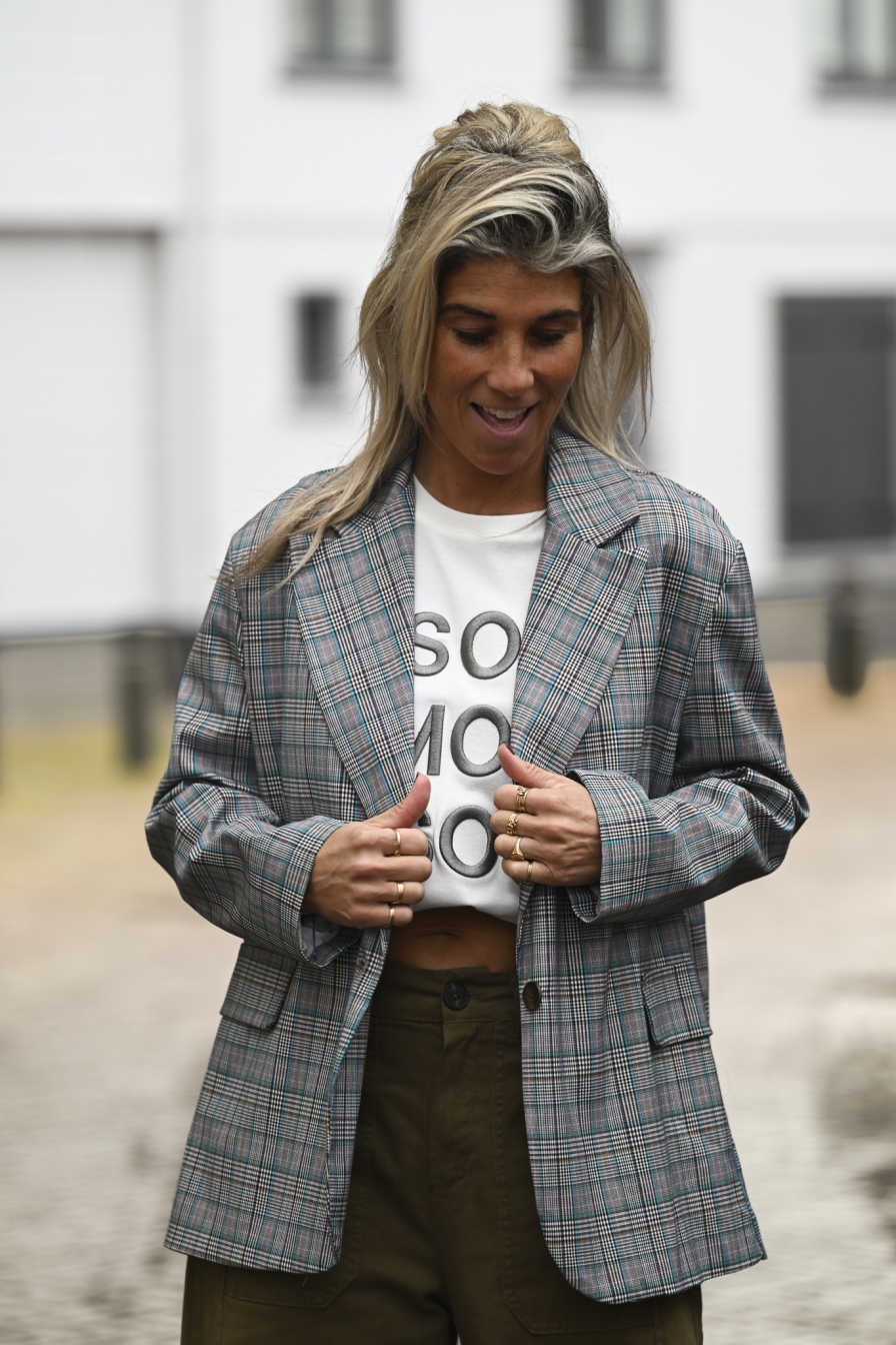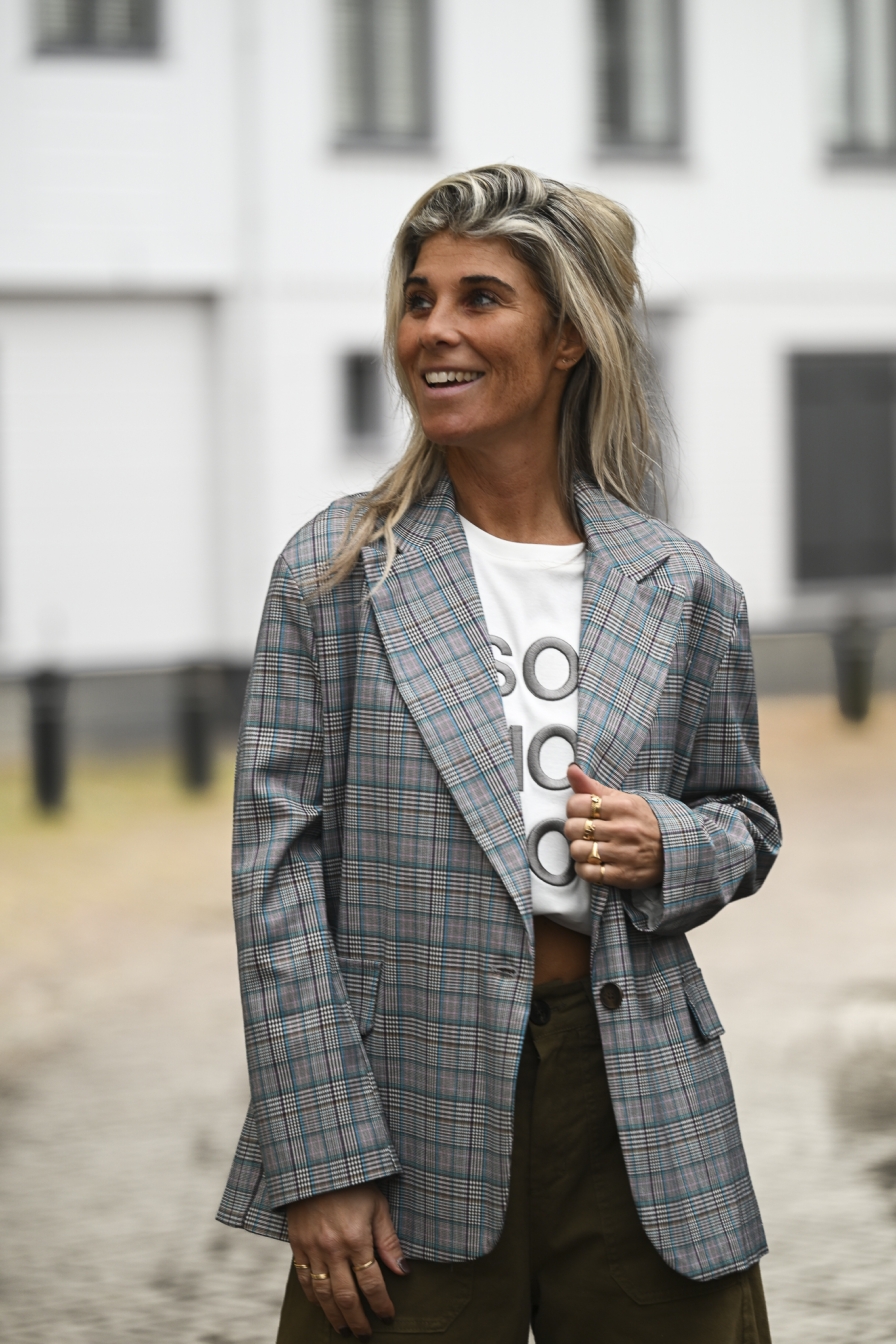 Heerlijke blazer in ruitjespatroon (grijs-turquoise-blauw-beige). Op de foto draag ik maat S/M en ben ik 1,76 m lang.