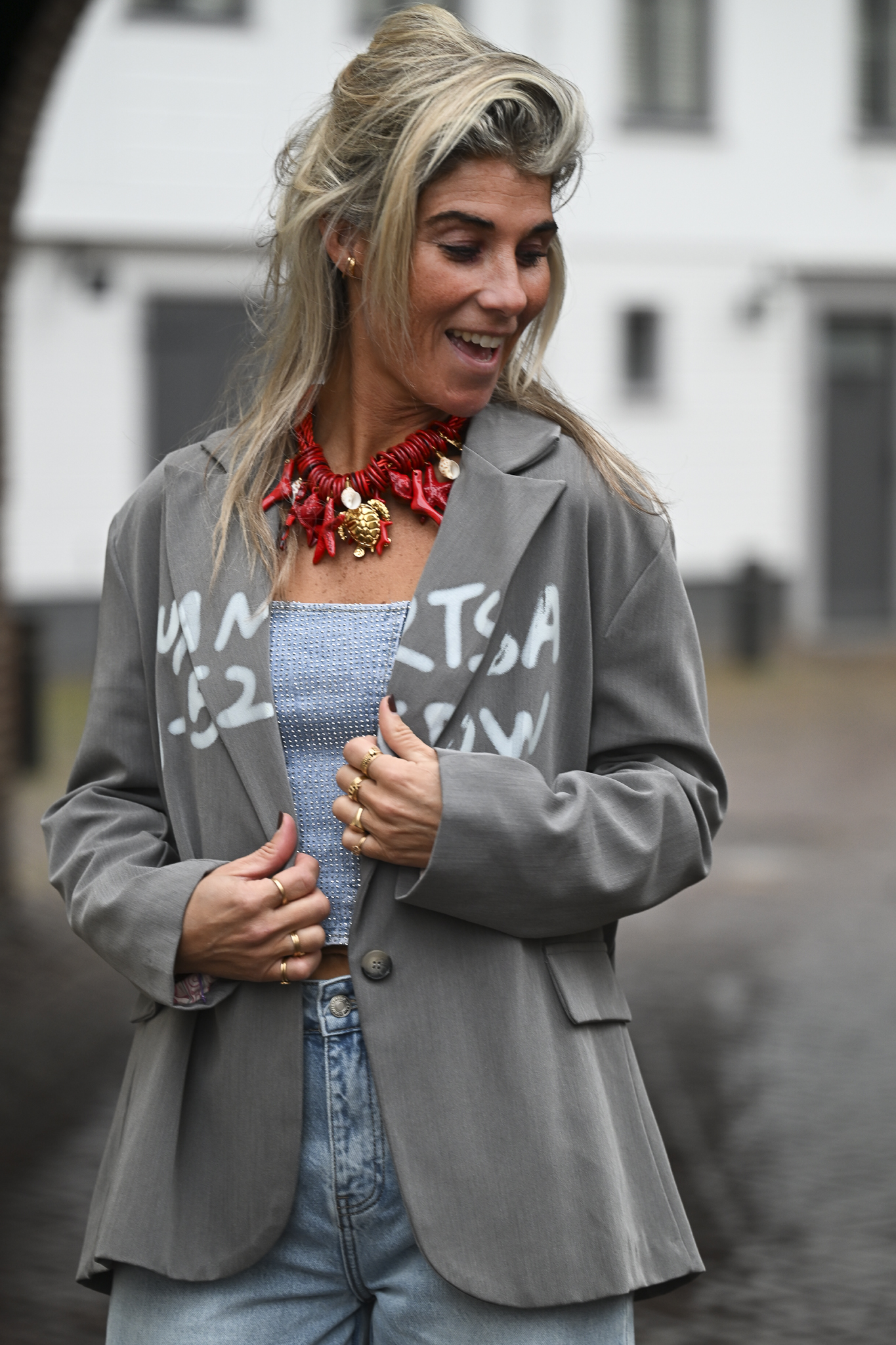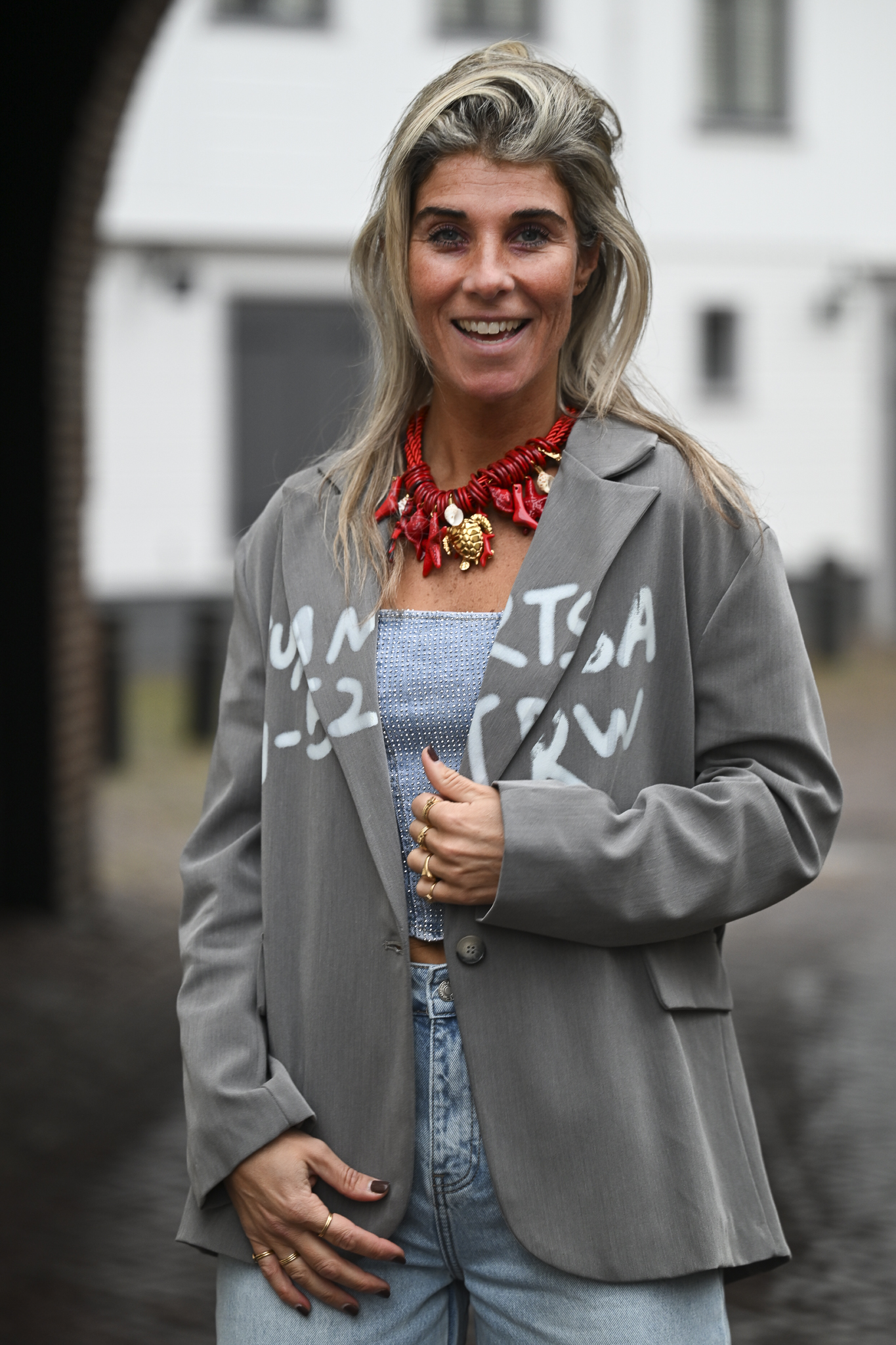 Dit is een gave grijze oversized blazer met een handmade grafische print (TUMTSA 2 NW) op de voorkant en een roze binnenvoering met...