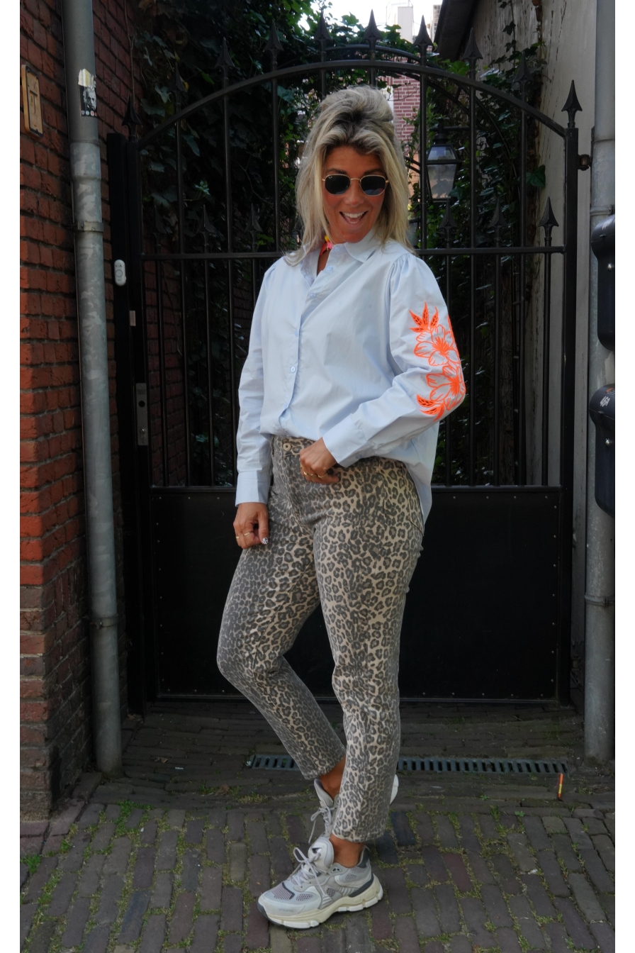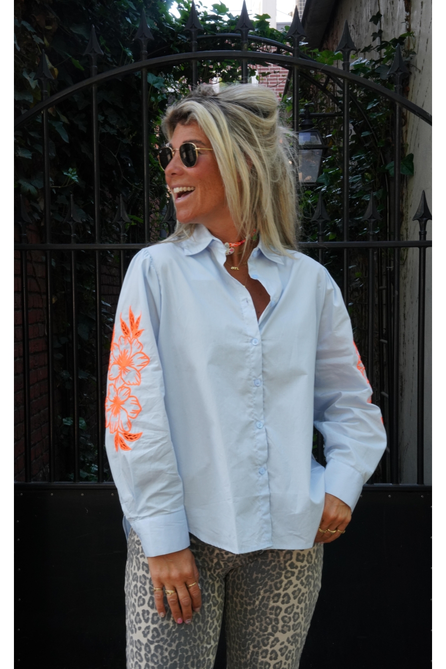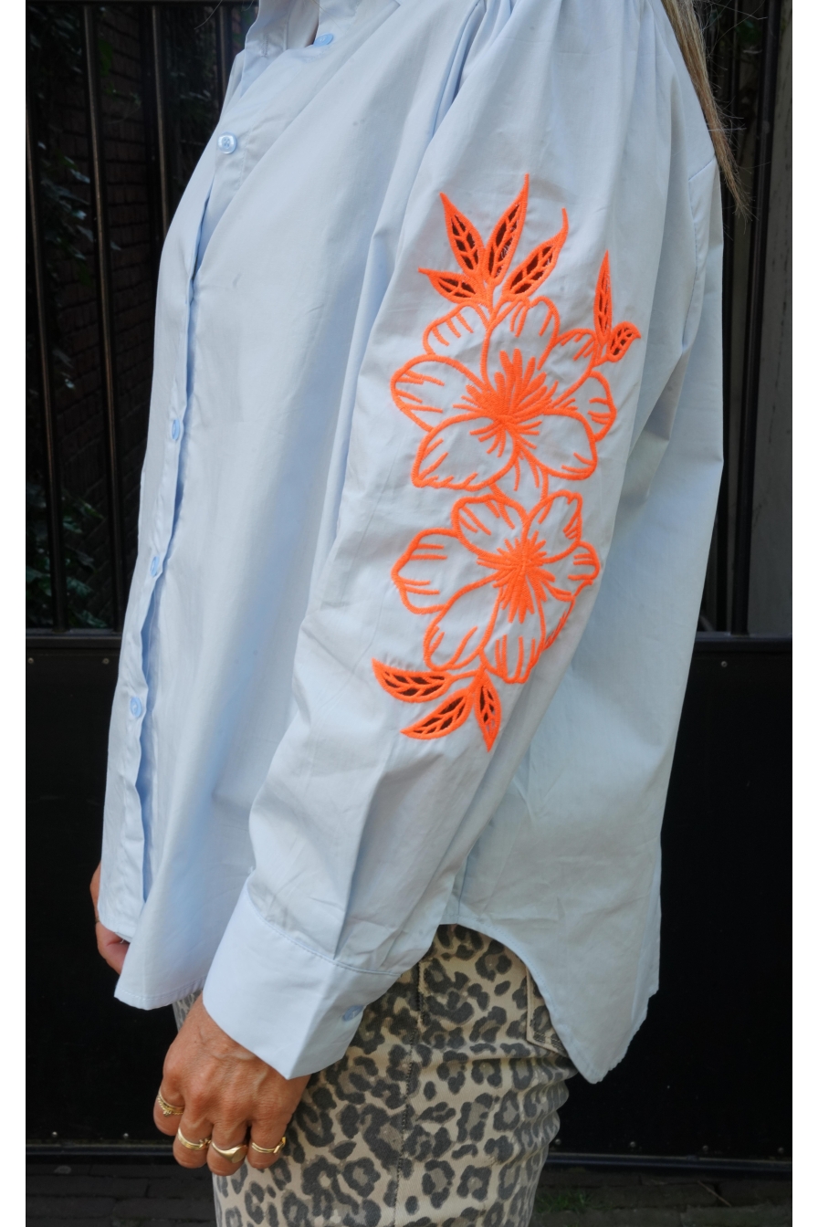100% katoen, 100% WAUW-factor– met knallende oranje bloemen op de mouwen die ELKE blik vangen! Achter kant valt mooi over de billen...