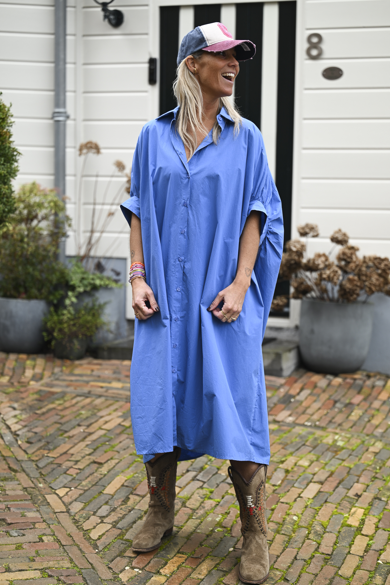 Blouse Dress Sofia is gemaakt van 100% katoen en heeft een loose fit model met knopen van boven tot onder. Let vooral op de gave korte pofmouwtjes. Dit onesize model draag je tot en met maat XL.