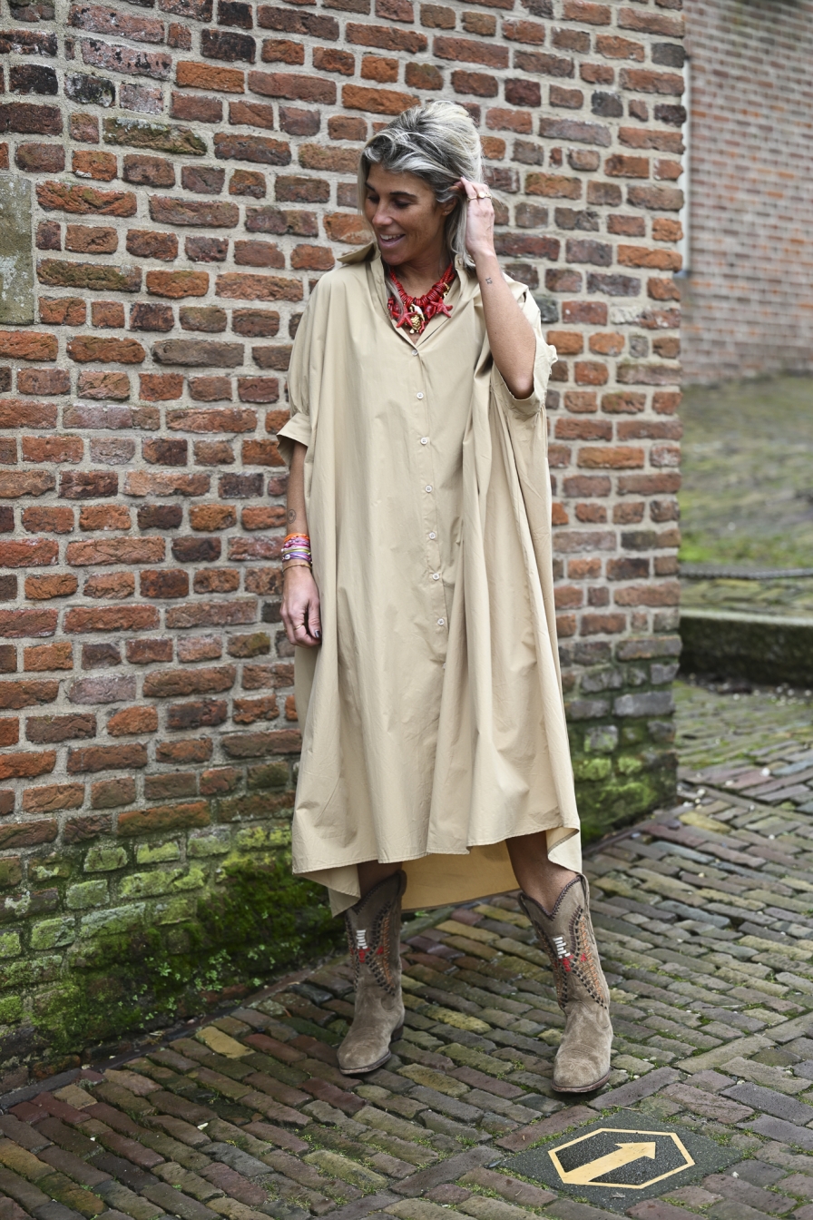 Blouse Dress Sofia is gemaakt van 100% katoen en heeft een loose fit model met knopen van boven tot onder. Let vooral op de gave korte pofmouwtjes. Dit onesize model draag je tot en met maat XL.