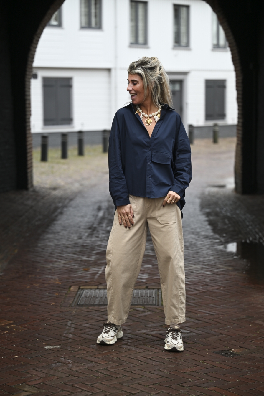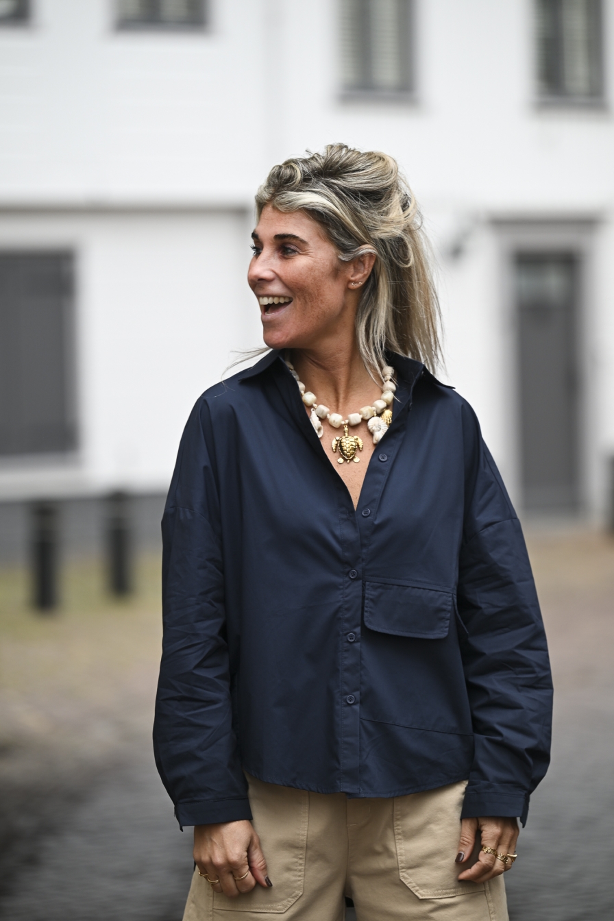 Blouse Essy heeft alles wat wij zoeken in een blouse: gemaakt van 100% katoen, de achterkant is langer en valt mooi over de bil, en linksonder zitten twee klepzakjes. Dit loose fit model draag je tot en met maat XL.