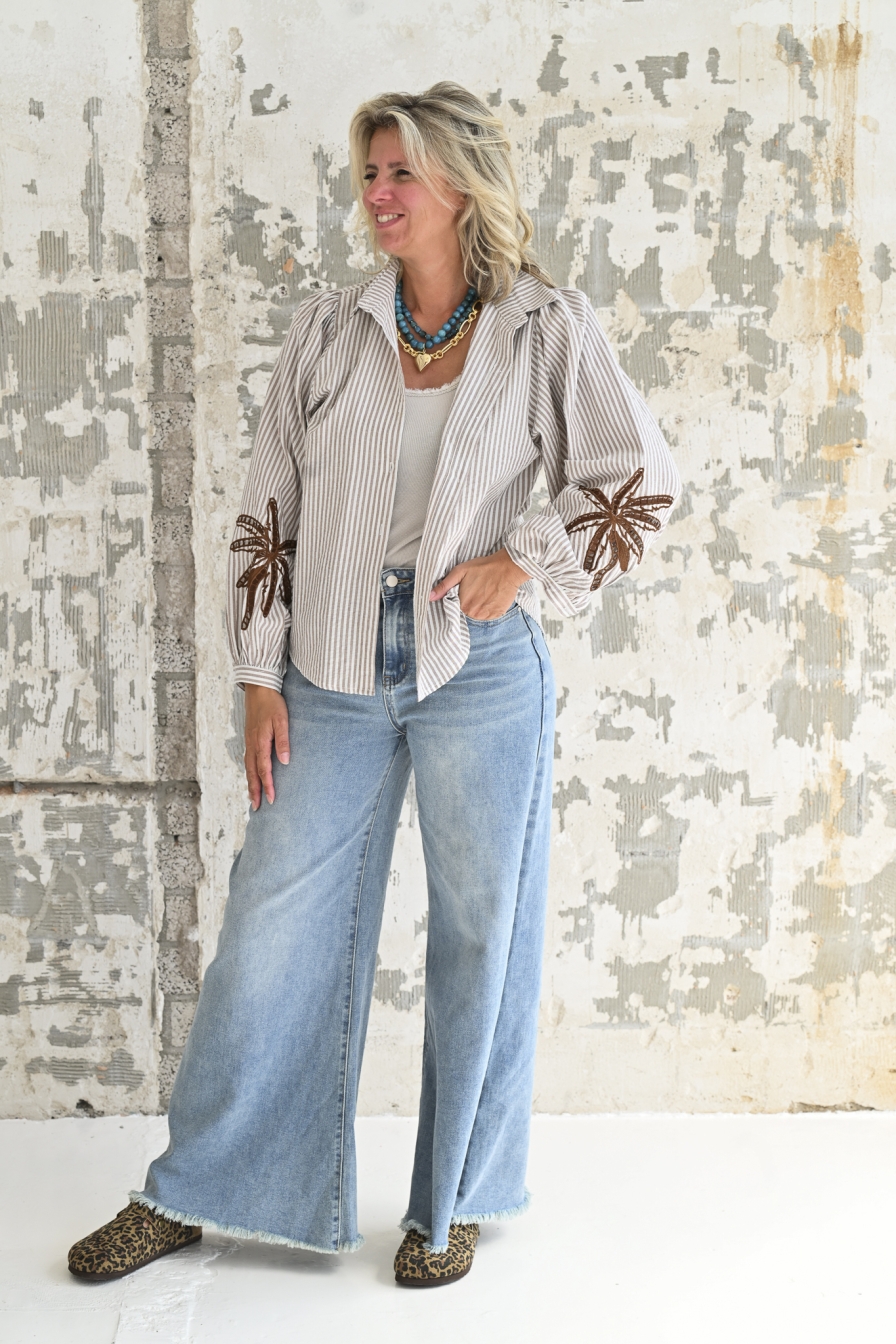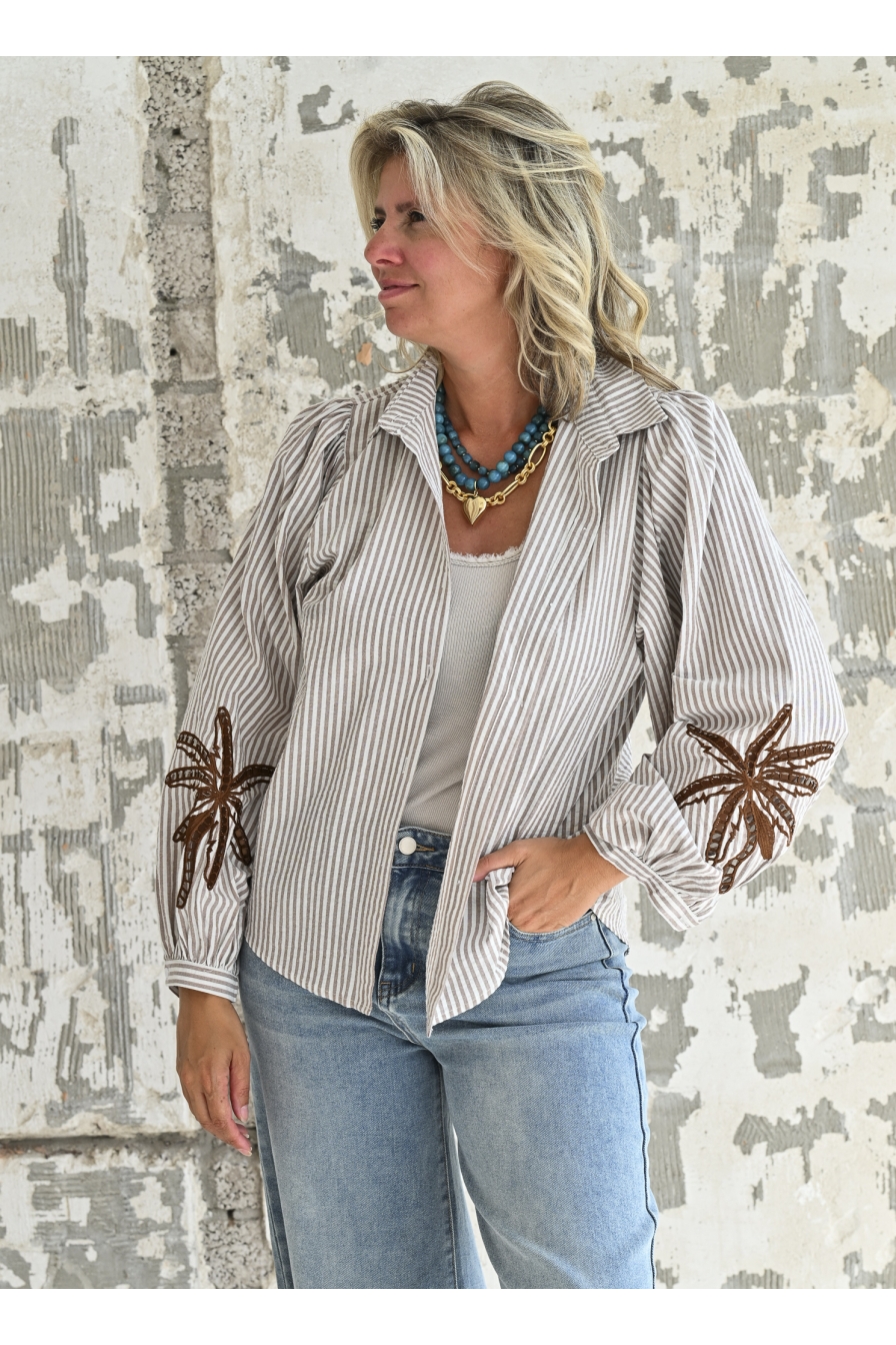 Blouse Layla in beige is gemaakt van 100% katoen en heeft een unieke gestikte choco palmboom op de bovenkant van de mouw. Op de foto...