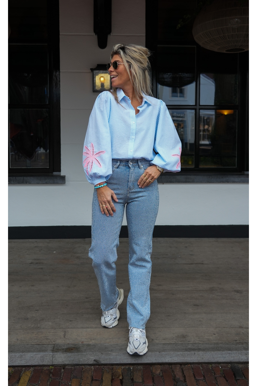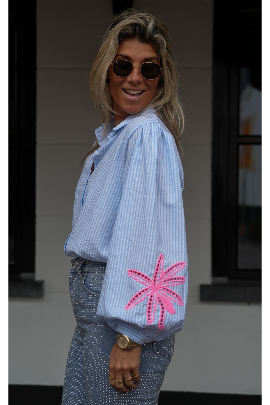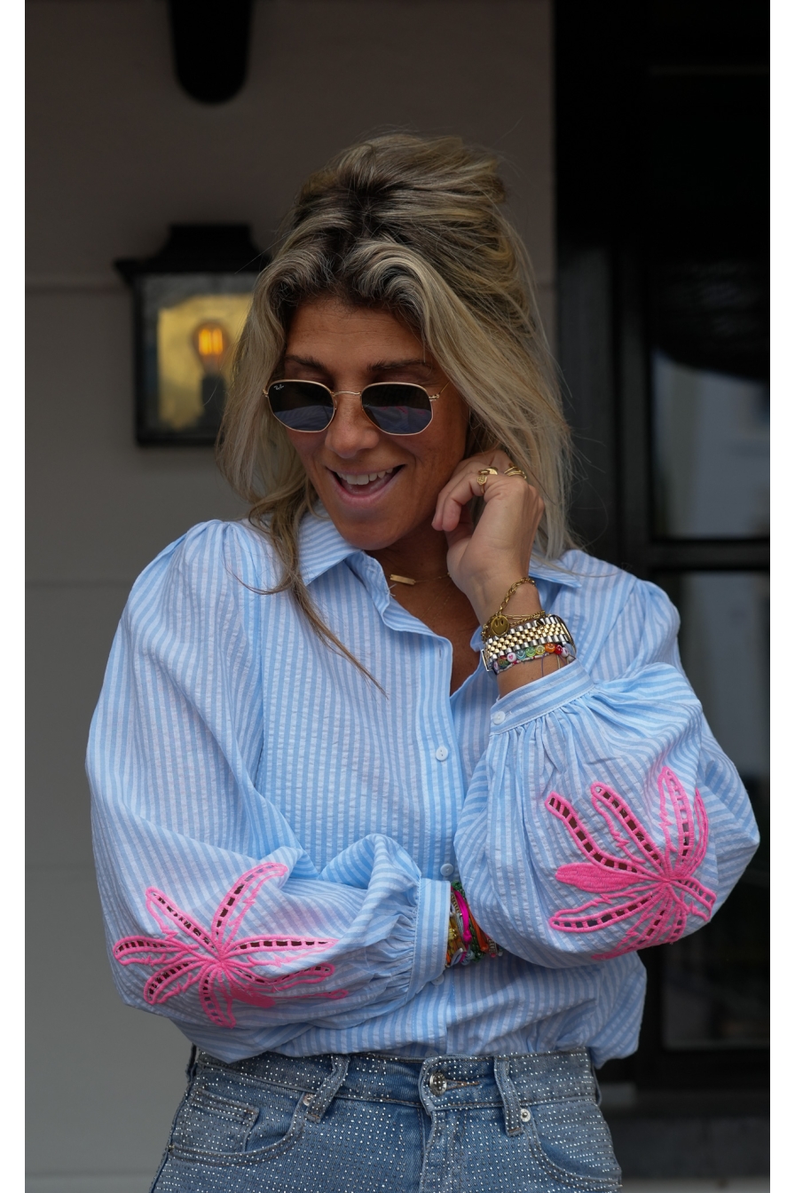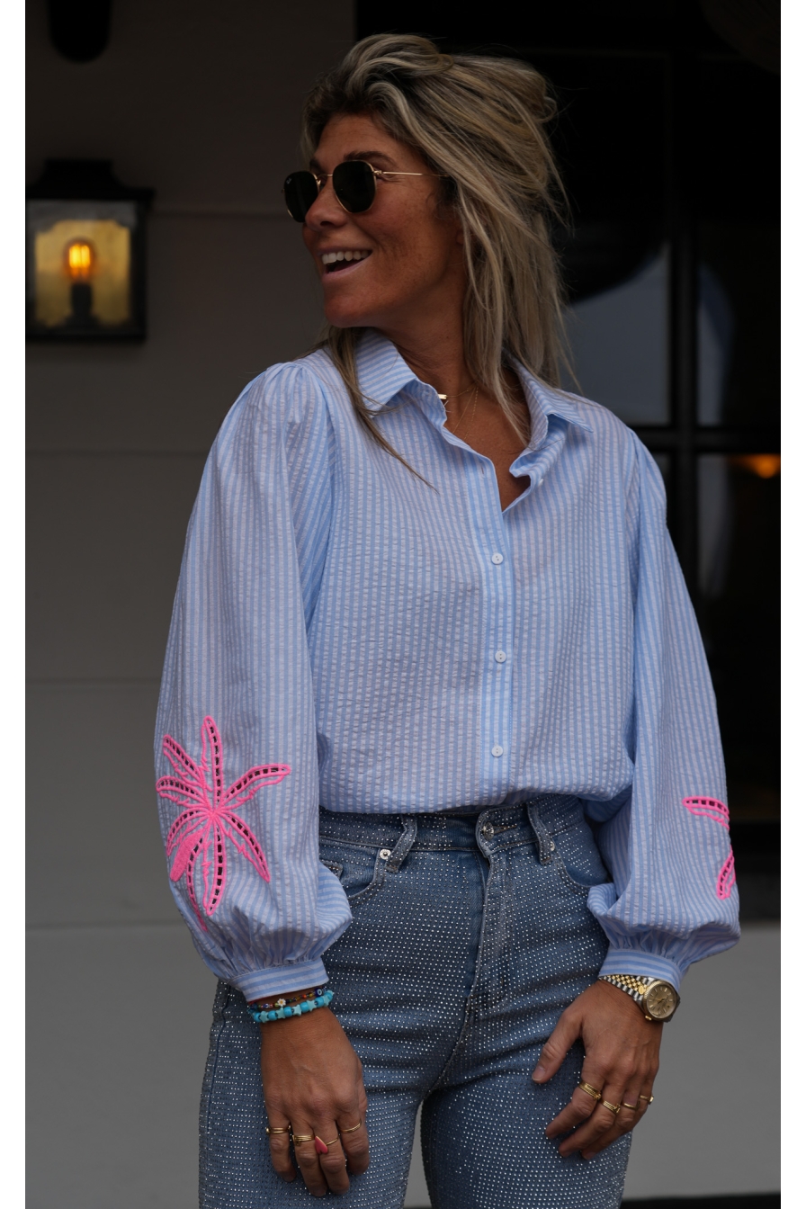 De Blouse Layla in blauw is gemaakt van 100% katoen en heeft een unieke gestikte fuchsia palmboom op de bovenkant van de mouw. Op de...