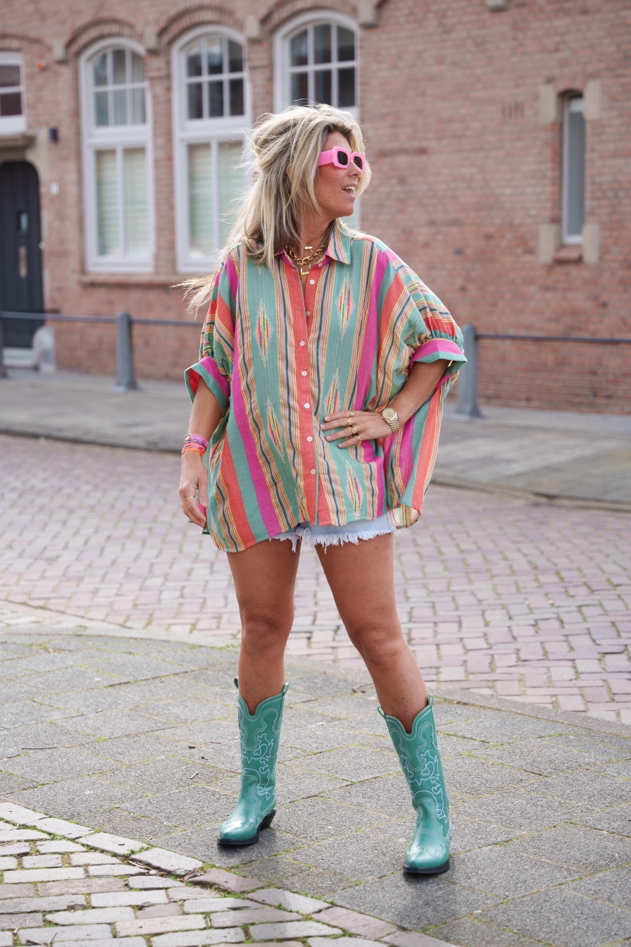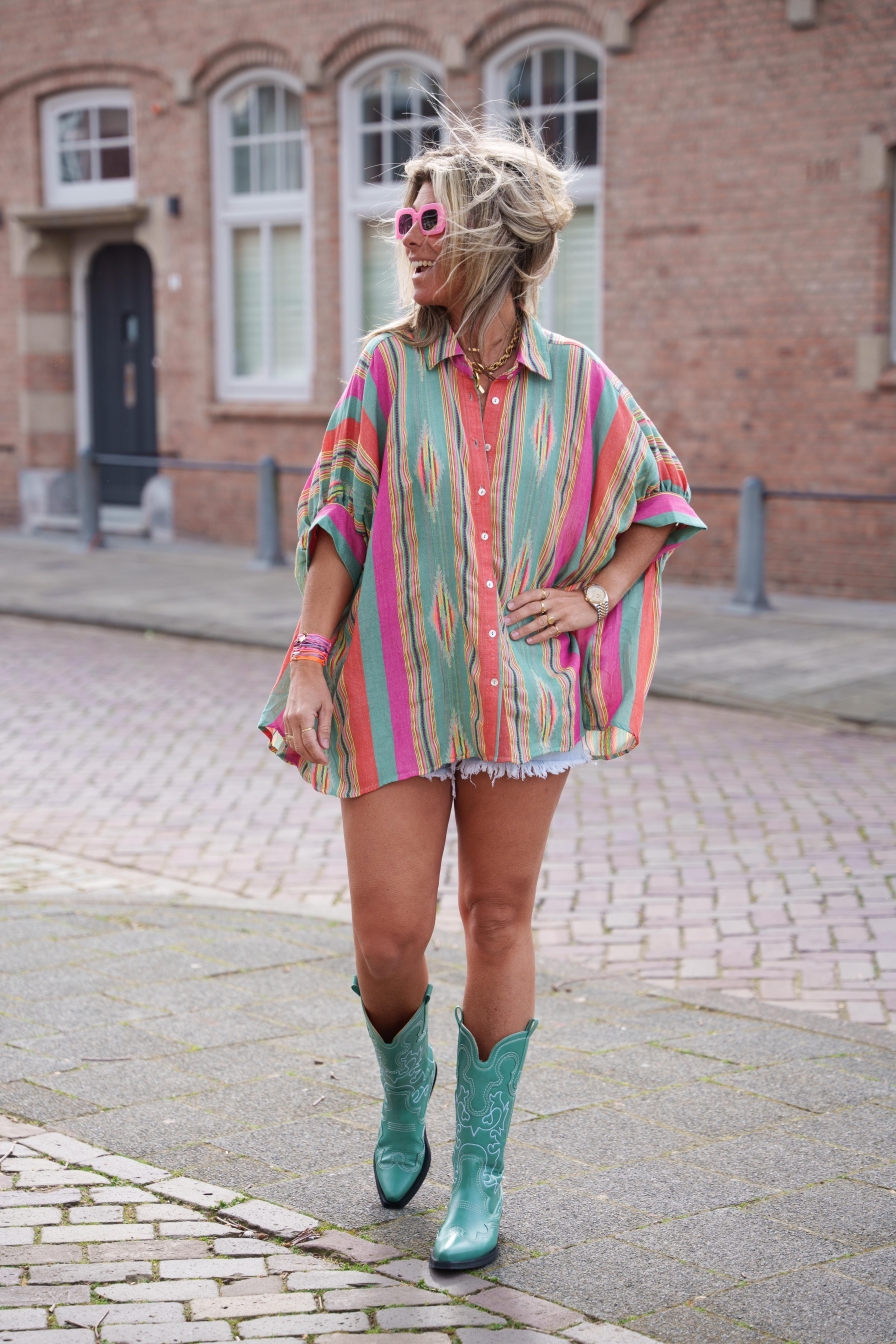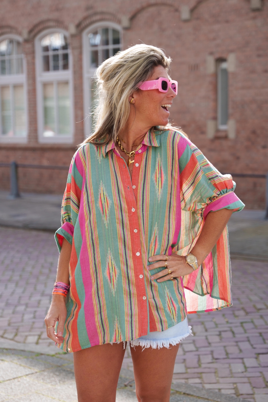Blouse Nima, vervaardigd uit 100% katoen, biedt comfort en stijl in één. Met zijn ruime pasvorm draag je deze blouse tot en met maat XL