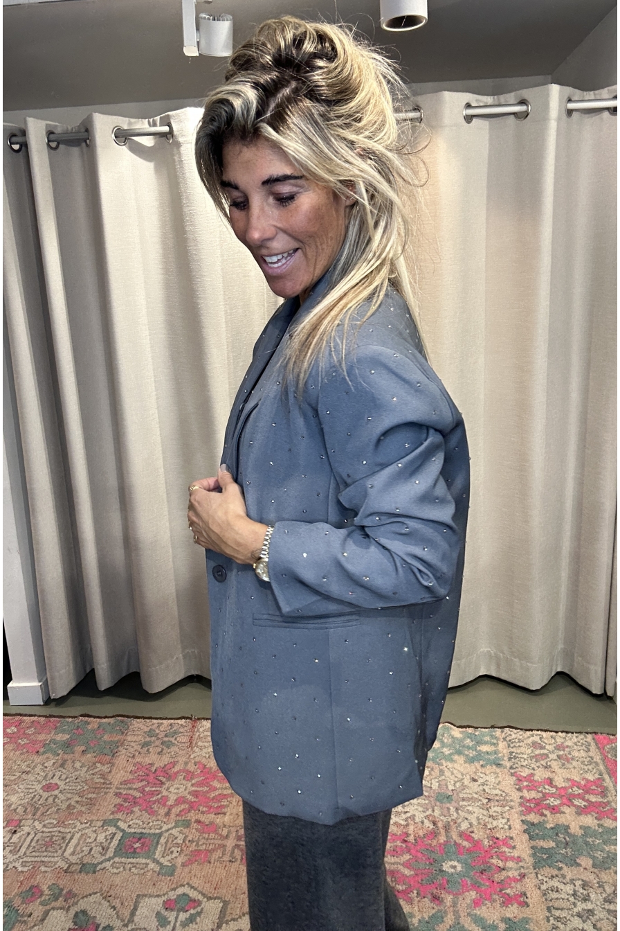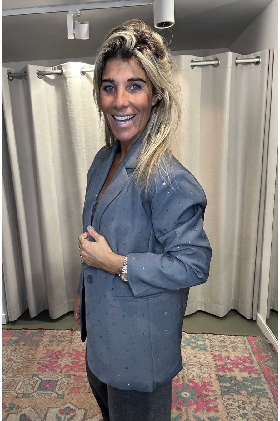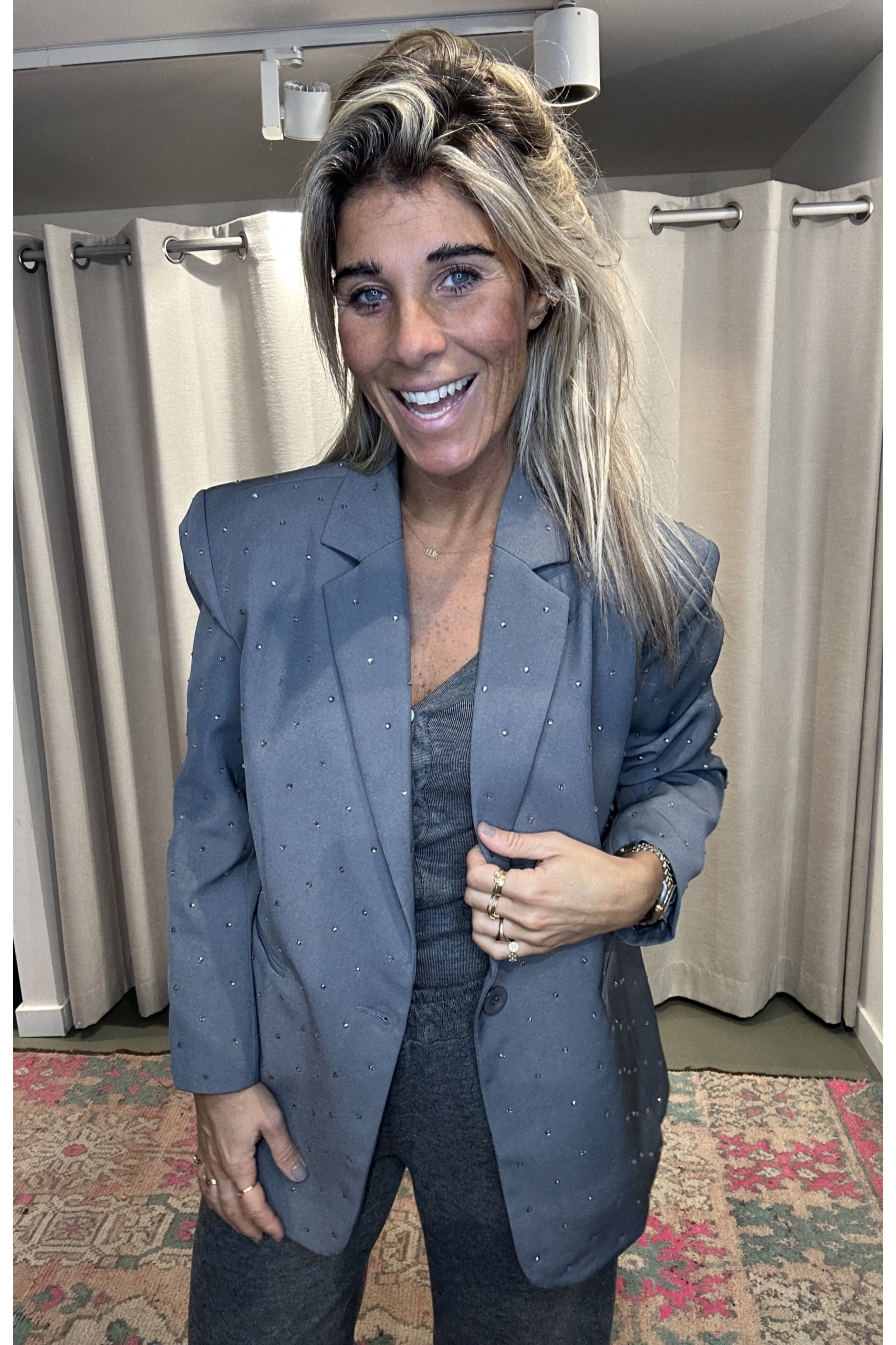 De blazer Myre heeft een subtiele glitter en een ruime pasvorm voor een relaxte look. Ik draag maat S/M op de foto.