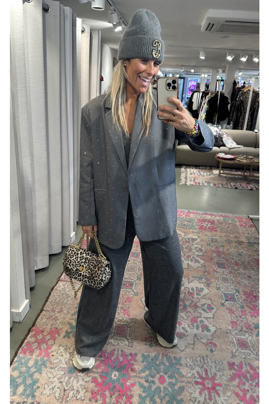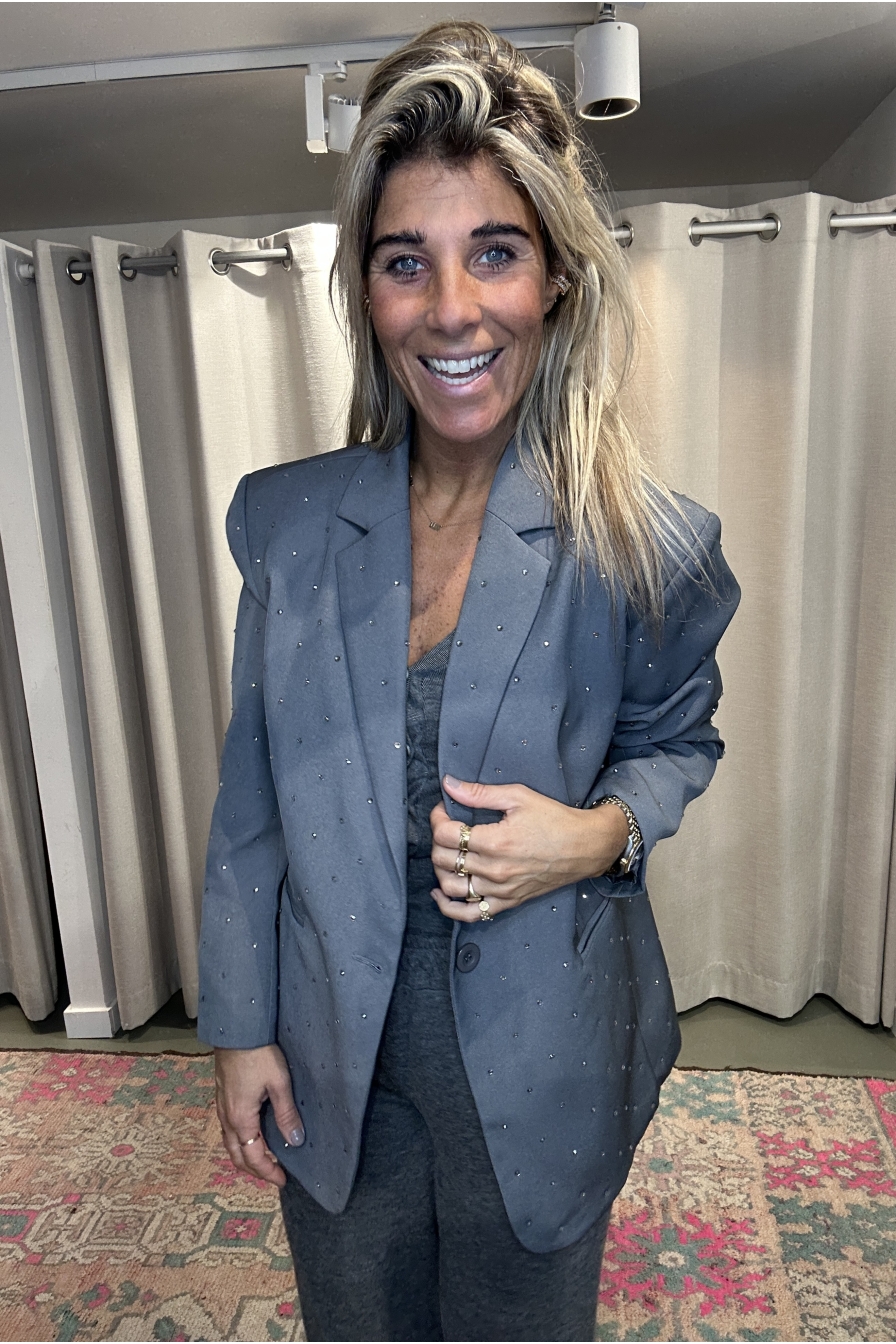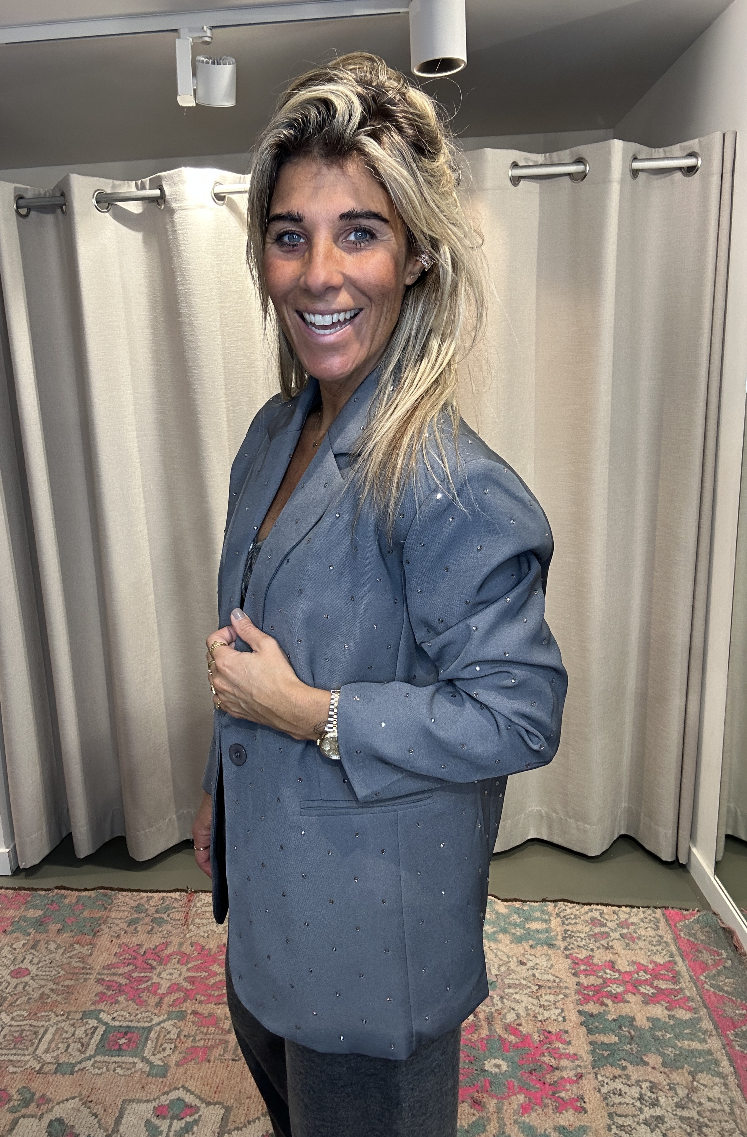 De blazer Myre heeft een subtiele glitter en een ruime pasvorm voor een relaxte look. Ik draag maat S/M op de foto.