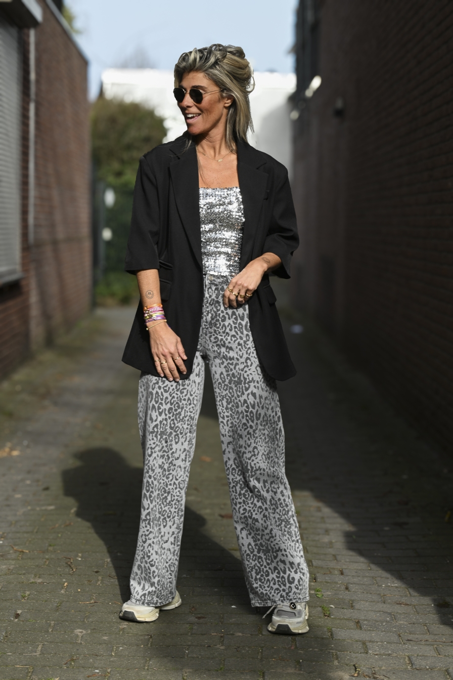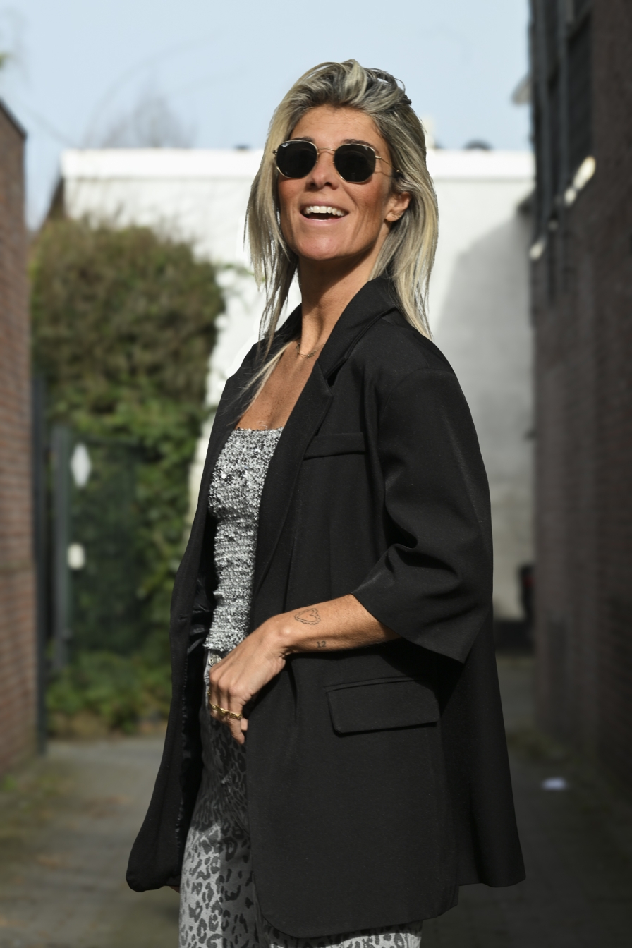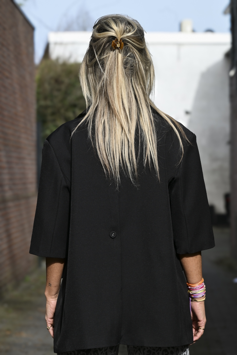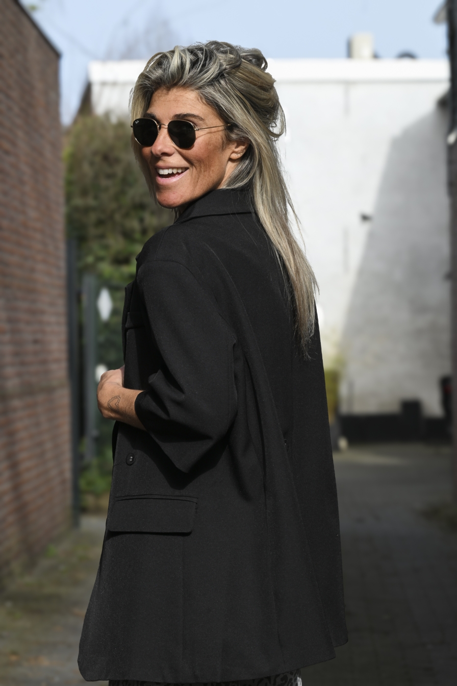 Summer blazer met 3/4 mouw en een heerlijk oversized fit. Ik draag maat S/M op de foto, zodat je goed kunt zien hoe hij valt. En vergeet vooral die leuke jeans niet mee te bestellen voor de complete look.