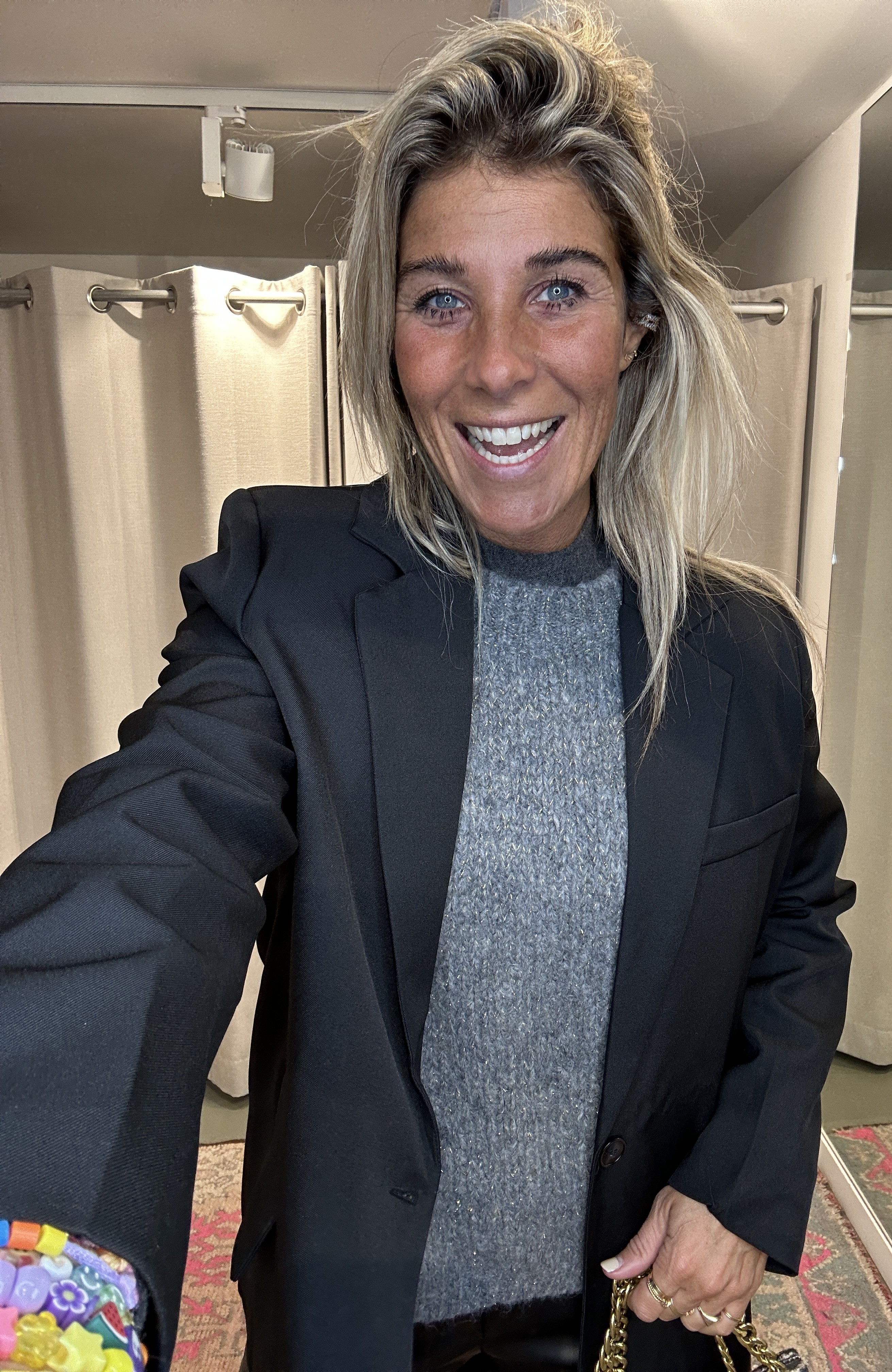 Onderschat nooit de kracht van een basic zwarte blazer. Dit tijdloze item is verkrijgbaar in twee maten: S/M en M/L. Op de foto draag...
