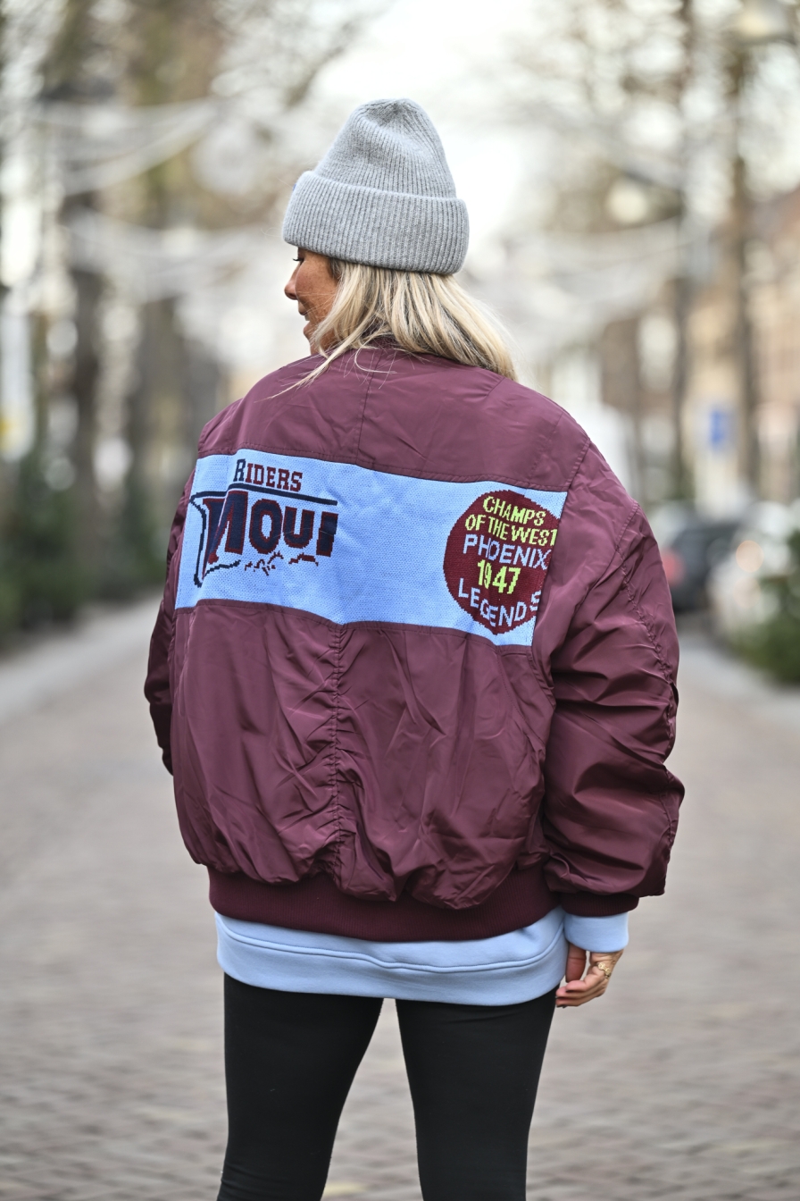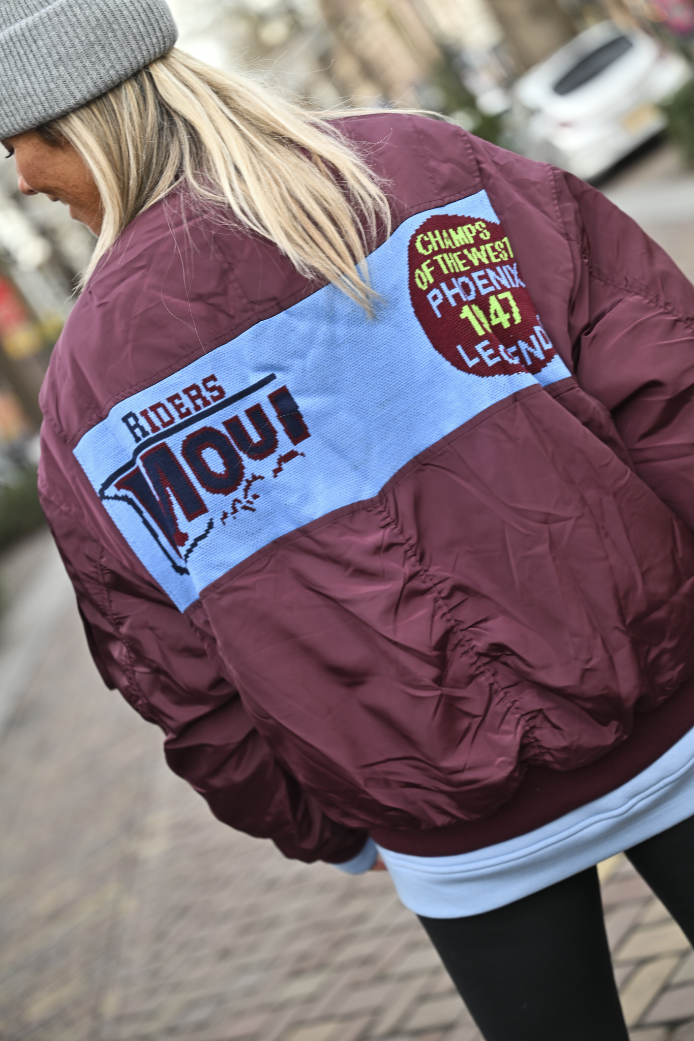 Exclusive Bomber Jacket – dé MUSTHAVE voor 2026. Deze jas valt mega oversized en tilt elke outfit naar een hoger niveau. Voorzien van een double sluiting, alsof je twee bomberjacks over elkaar draagt. Ruim model, verkrijgbaar in S-M-L. Ik draag maat M op de foto en ben 1.76 m. Op de rug zit een blauwe baan van stof met daarin de tekst: “Champs of the West Phoenix 1947 Legends”.