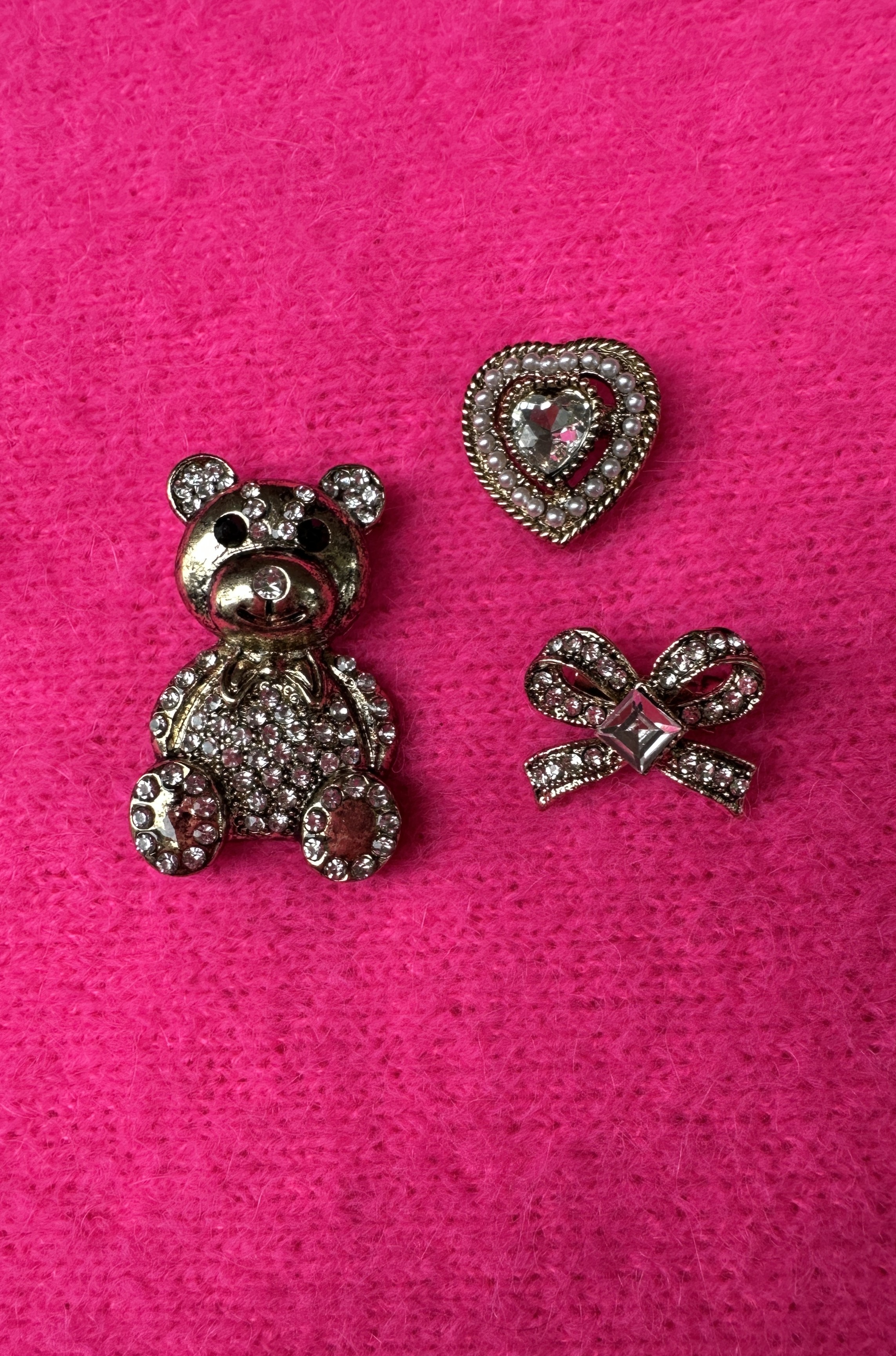 De teddy is 4 cm, het strikje 2 cm en het hartje 2 cm breed. We created a trend — and this is IT! Deze goudkleurige brocheset bestaat uit 3 lossebbroches en is dé finishing touch van je outfit. Elke broche heeft een stevige sluiting zodat ze perfect blijven zitten.Mix, match & shine!