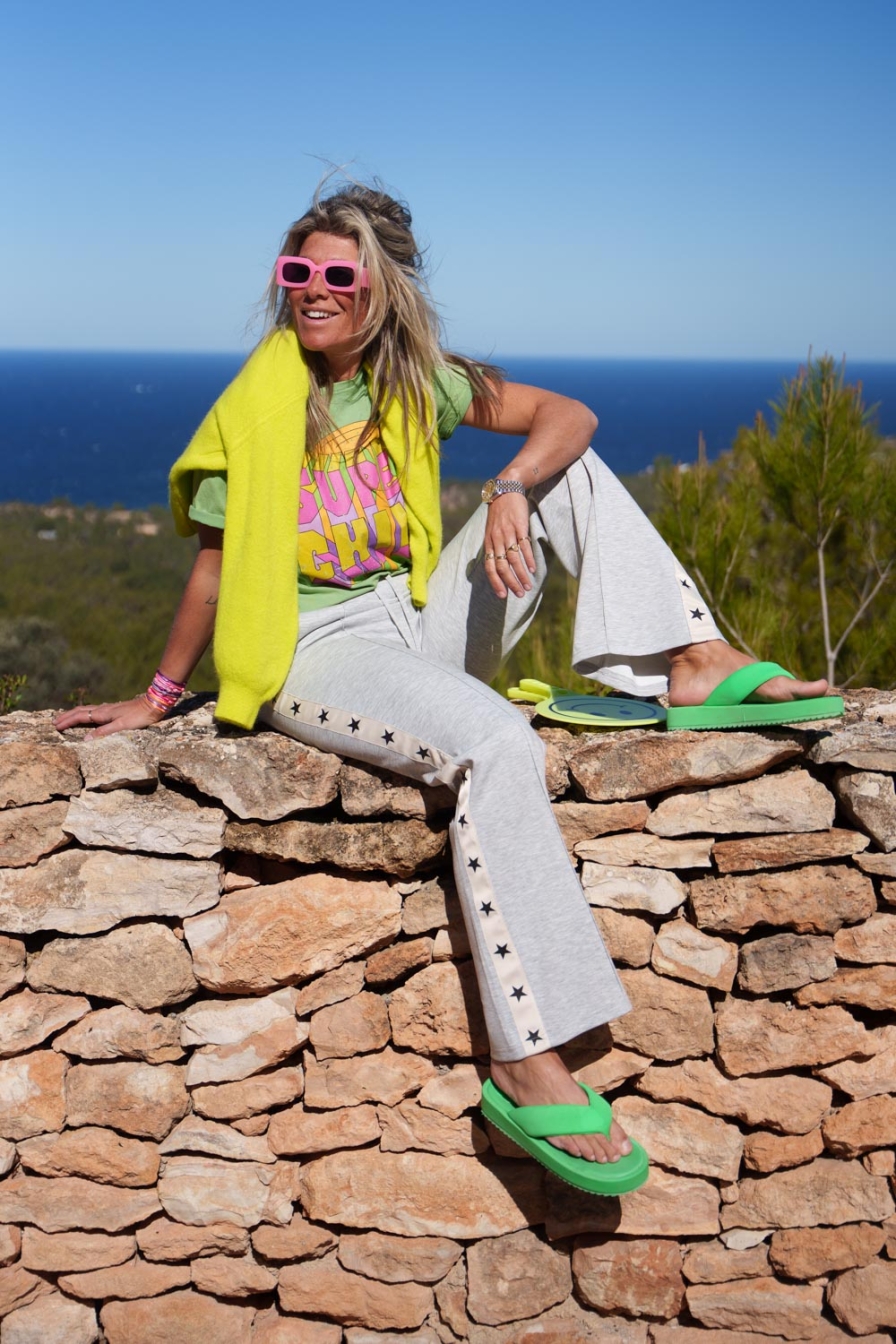 Broek Stars is een echte blikvanger! Met wijde broekspijpen, een elastische tailleband met aantrekkoorden, een naad en twee steekzakken, biedt deze broek ultiem comfort en stijl. De sterren aan de zijkant maken het helemaal af. Met mijn lengte van 1,76 m draag ik maat M.