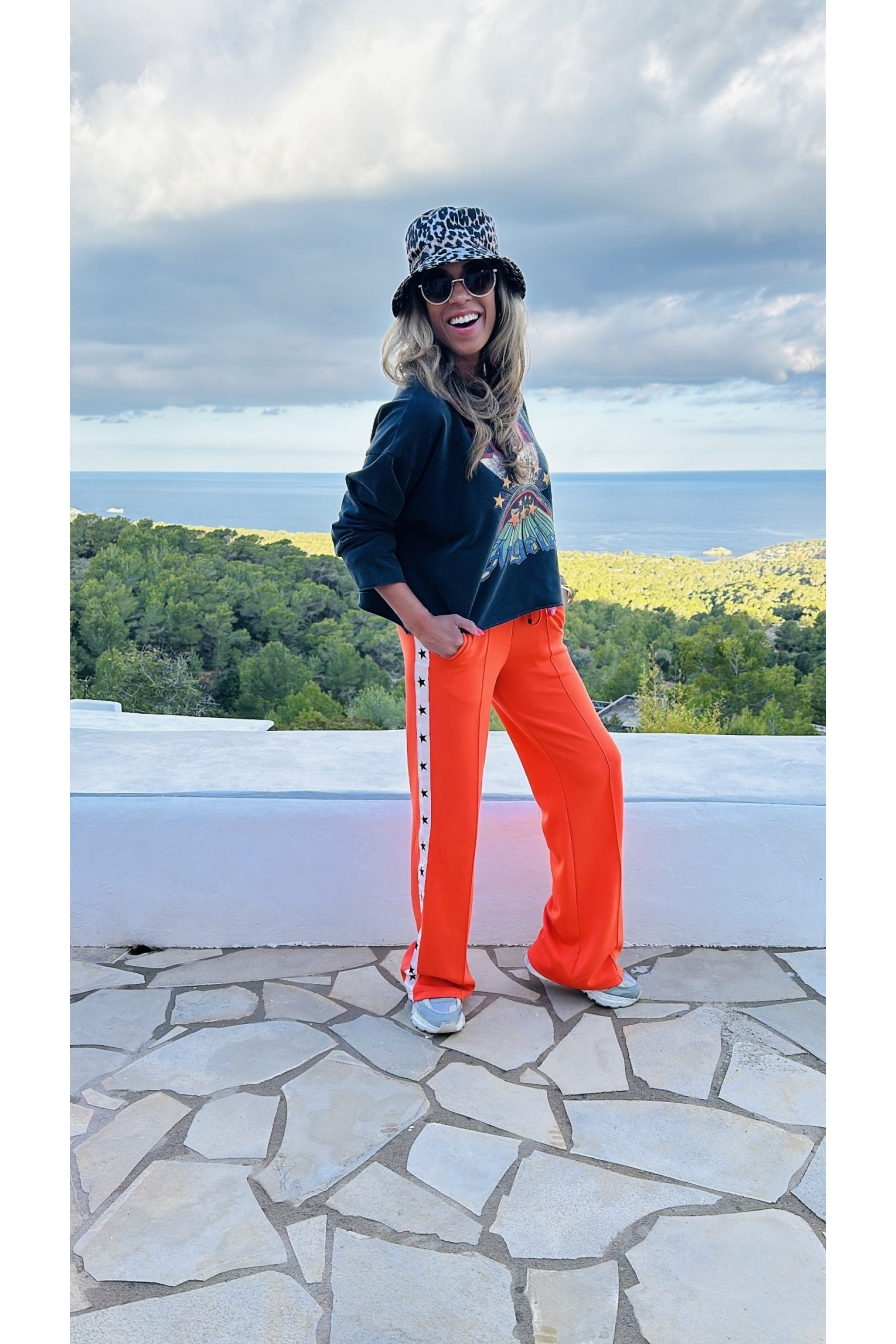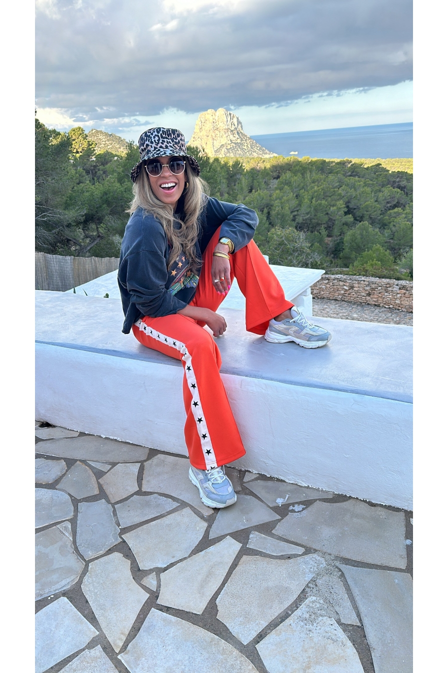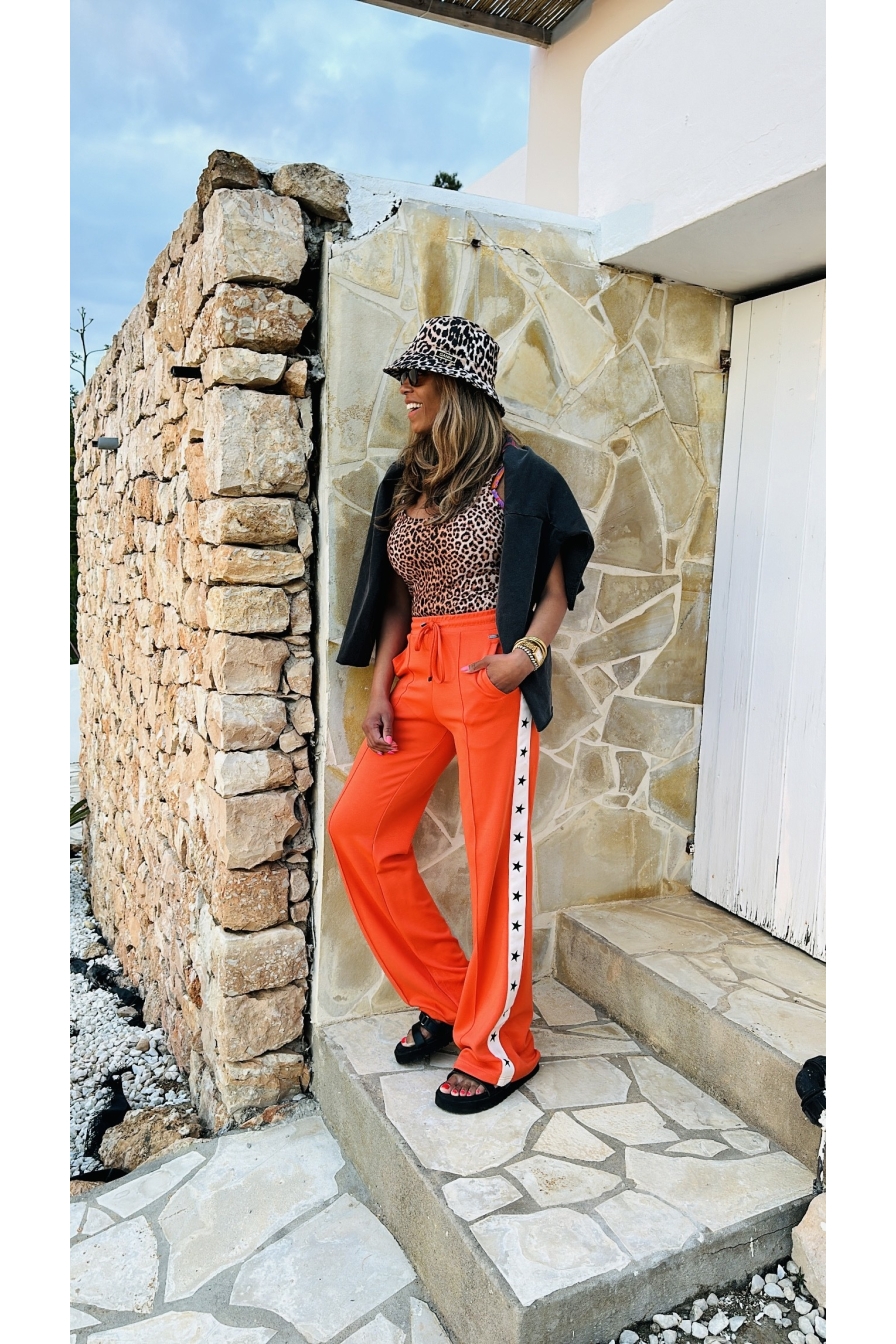 Broek Stars is een echte blikvanger! Met wijde broekspijpen, een elastische tailleband met aantrekkoorden, een naad en twee steekzakken, biedt deze broek ultiem comfort en stijl. De sterren aan de zijkant maken het helemaal af. Met mijn lengte van 1,76 m draag ik maat M.