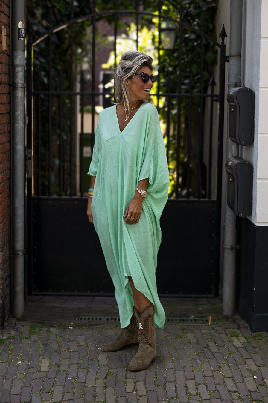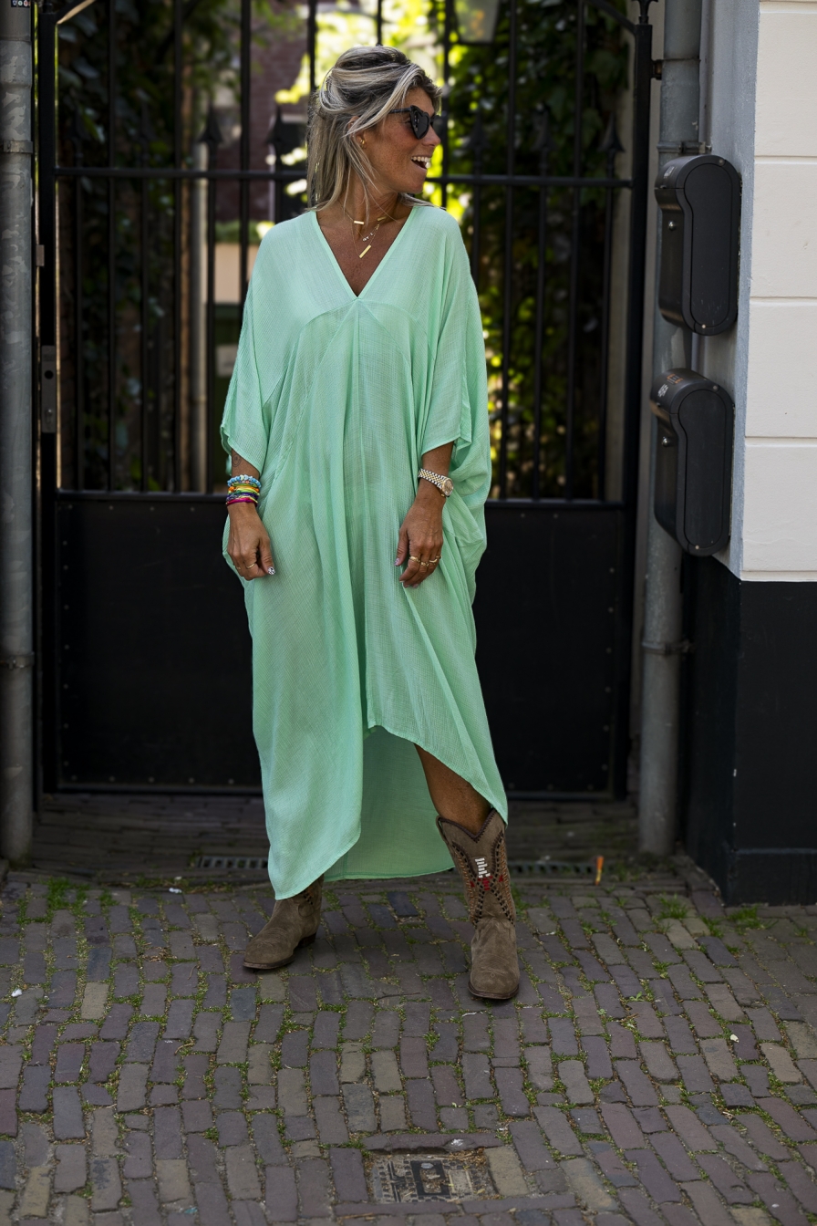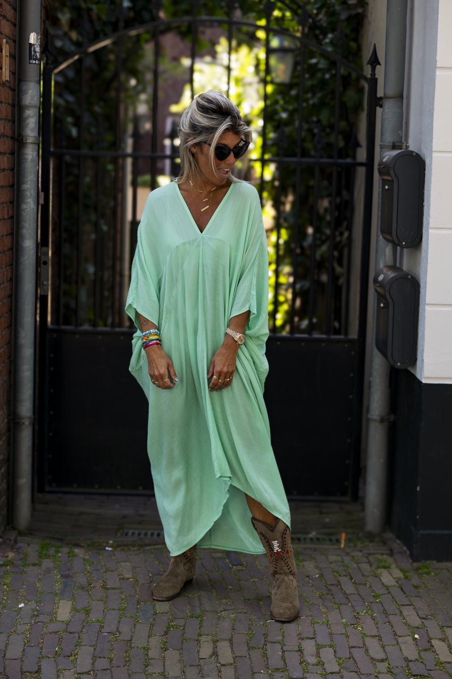 Butterfly Dress Romy brengt die ultieme Ibiza vibe! De zwierige vlindermouwen geven ‘m een speelse look, en de achterkant valt iets langer dan de voorkant voor dat extra boho-effect. Dit one-size model is lekker luchtig, heeft een fijne pasvorm en draag je moeiteloos tot en met maat L/XL. Perfect voor zonnige dagen, festivals of gewoon omdat je je fabulous wilt voelen!