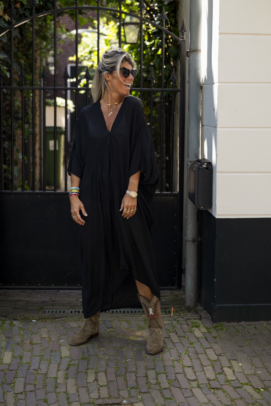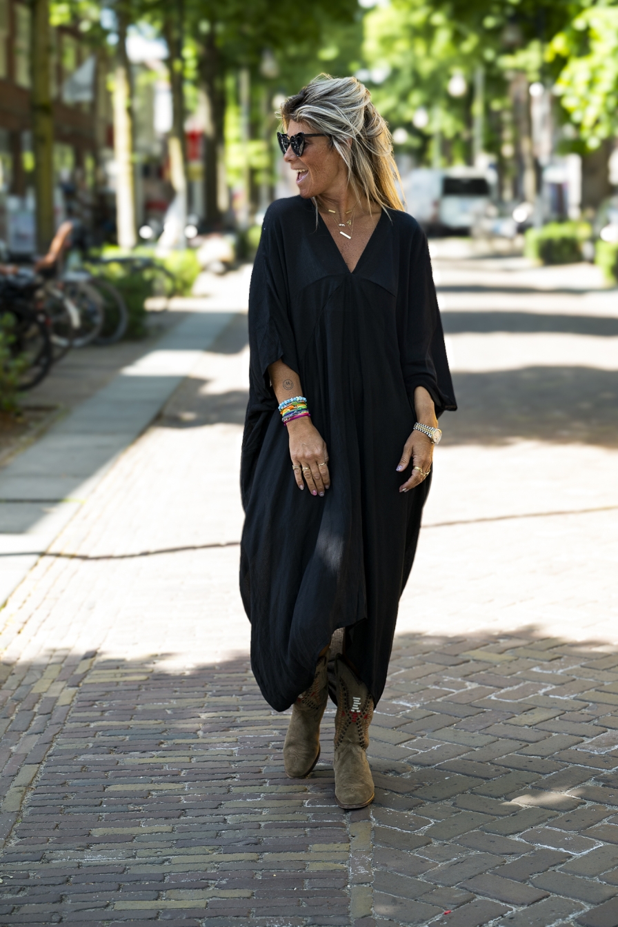 Butterfly Dress Romy brengt die ultieme Ibiza vibe! De zwierige vlindermouwen geven ‘m een speelse look, en de achterkant valt iets langer dan de voorkant voor dat extra boho-effect. Dit one-size model is lekker luchtig, heeft een fijne pasvorm en draag je moeiteloos tot en met maat L/XL. Perfect voor zonnige dagen, festivals of gewoon omdat je je fabulous wilt voelen!