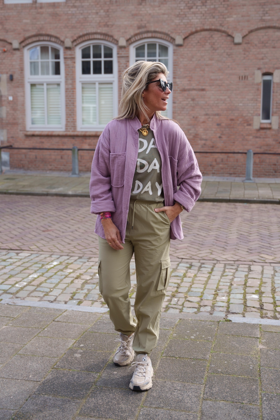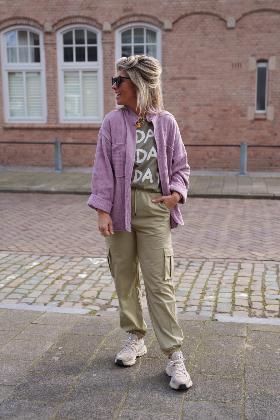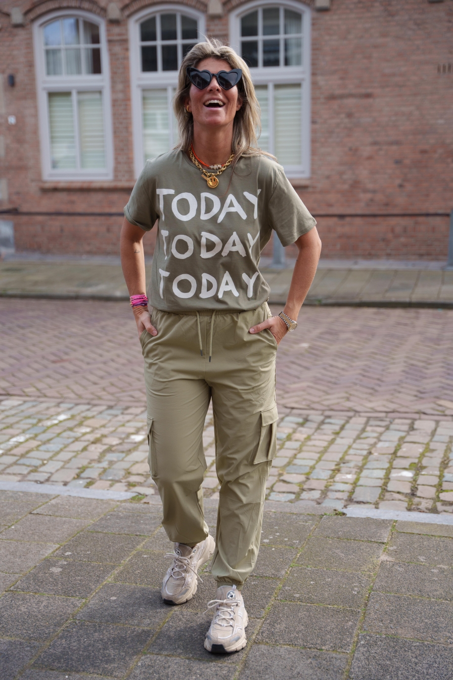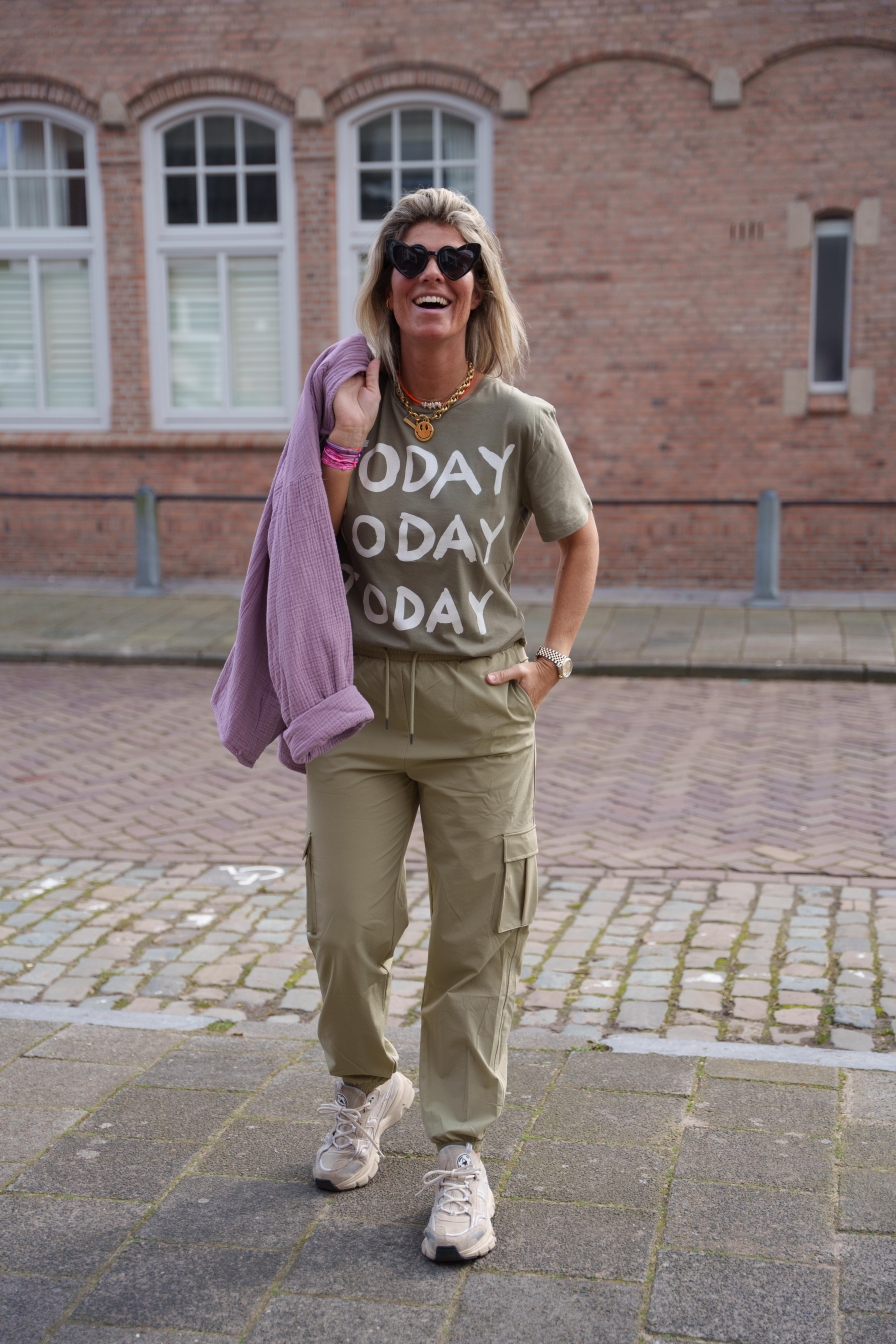 Deze elastische legergroene cargo broek, compleet met trekkoord en handige steekzakken, is perfect voor een mix van stijl en comfort. Met mijn 1,76 draag ik op de foto een M.