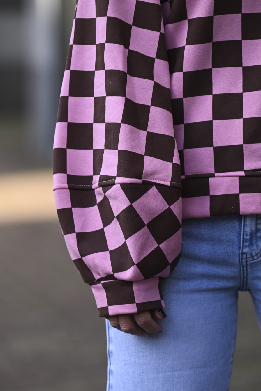 Wat een print op deze onesize sweater met pofmouwen! Vierkant, square, carré – noem het zoals je wilt, maar deze sweater (65% katoen) pimt alles naar een next level. Draagbaar tot maat L/XL.