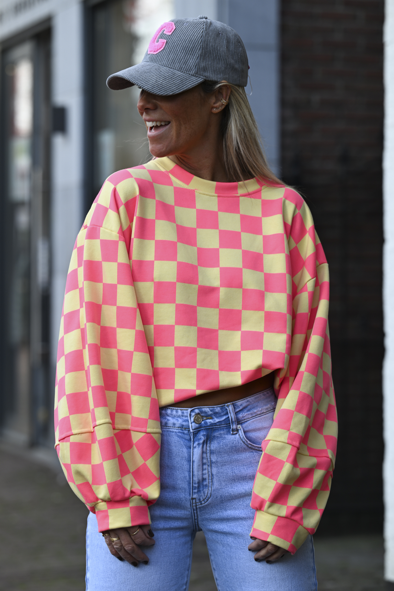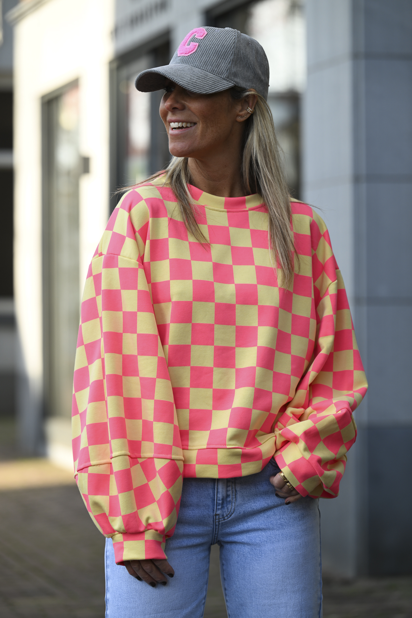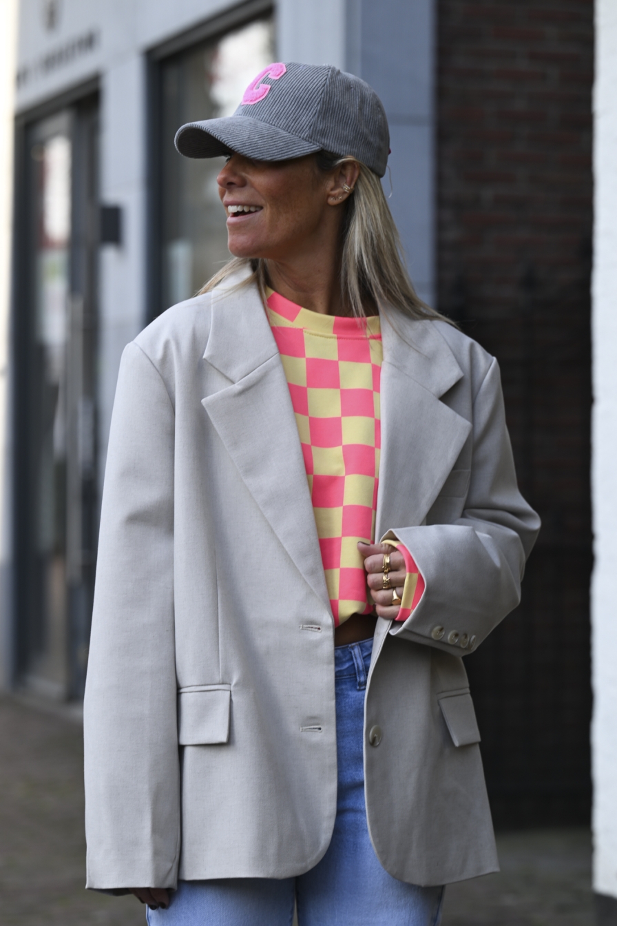 Wat een print op deze onesize sweater met pofmouwen! Vierkant, square, carré – noem het zoals je wilt, maar deze sweater (65% katoen) pimt alles naar een next level. Draagbaar tot maat L/XL.