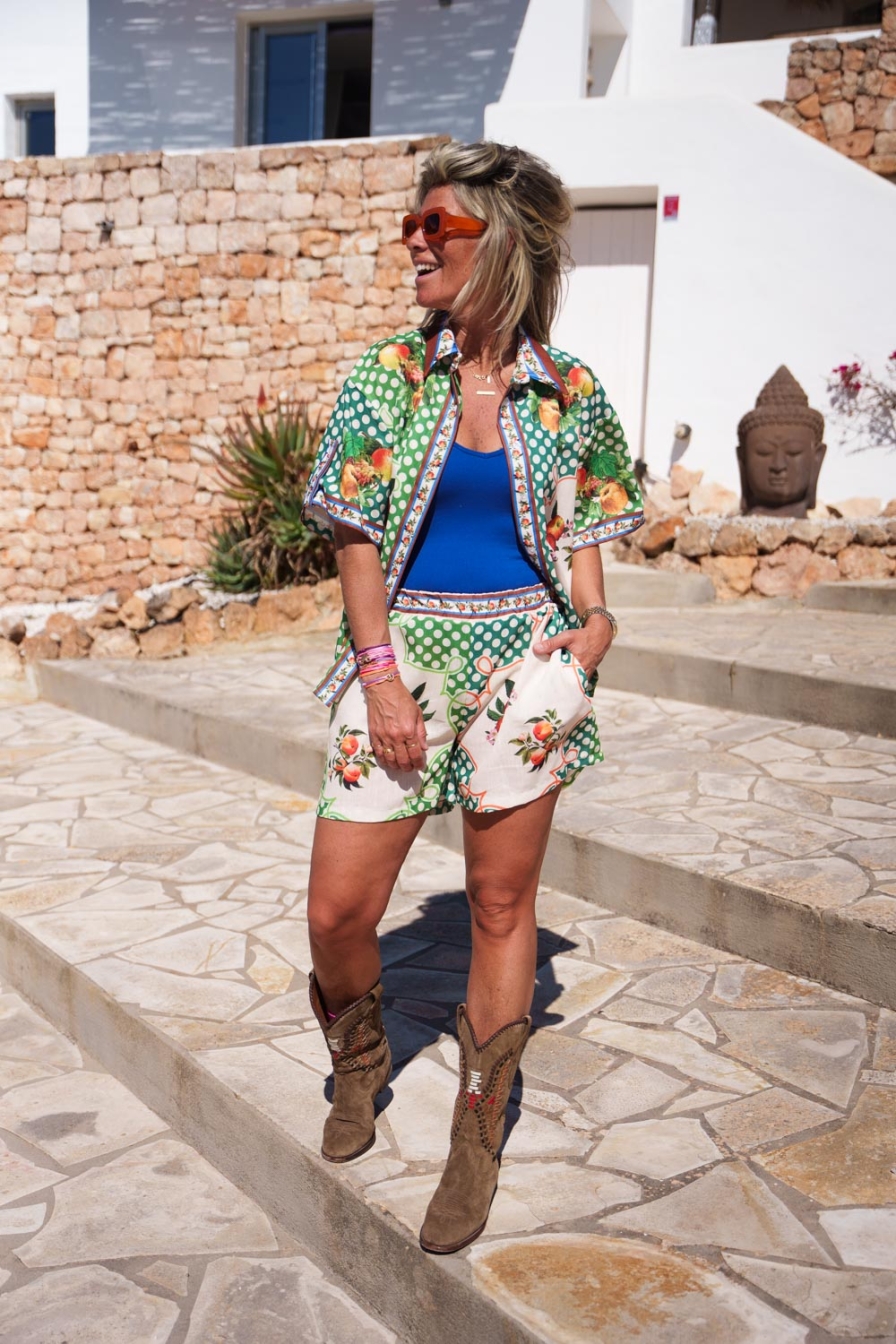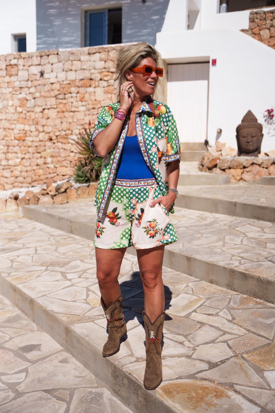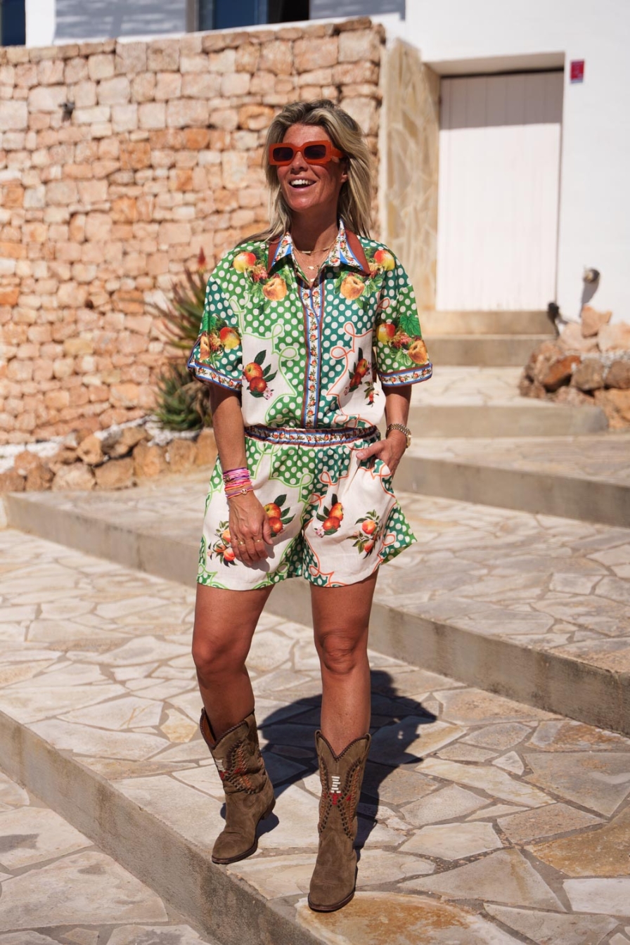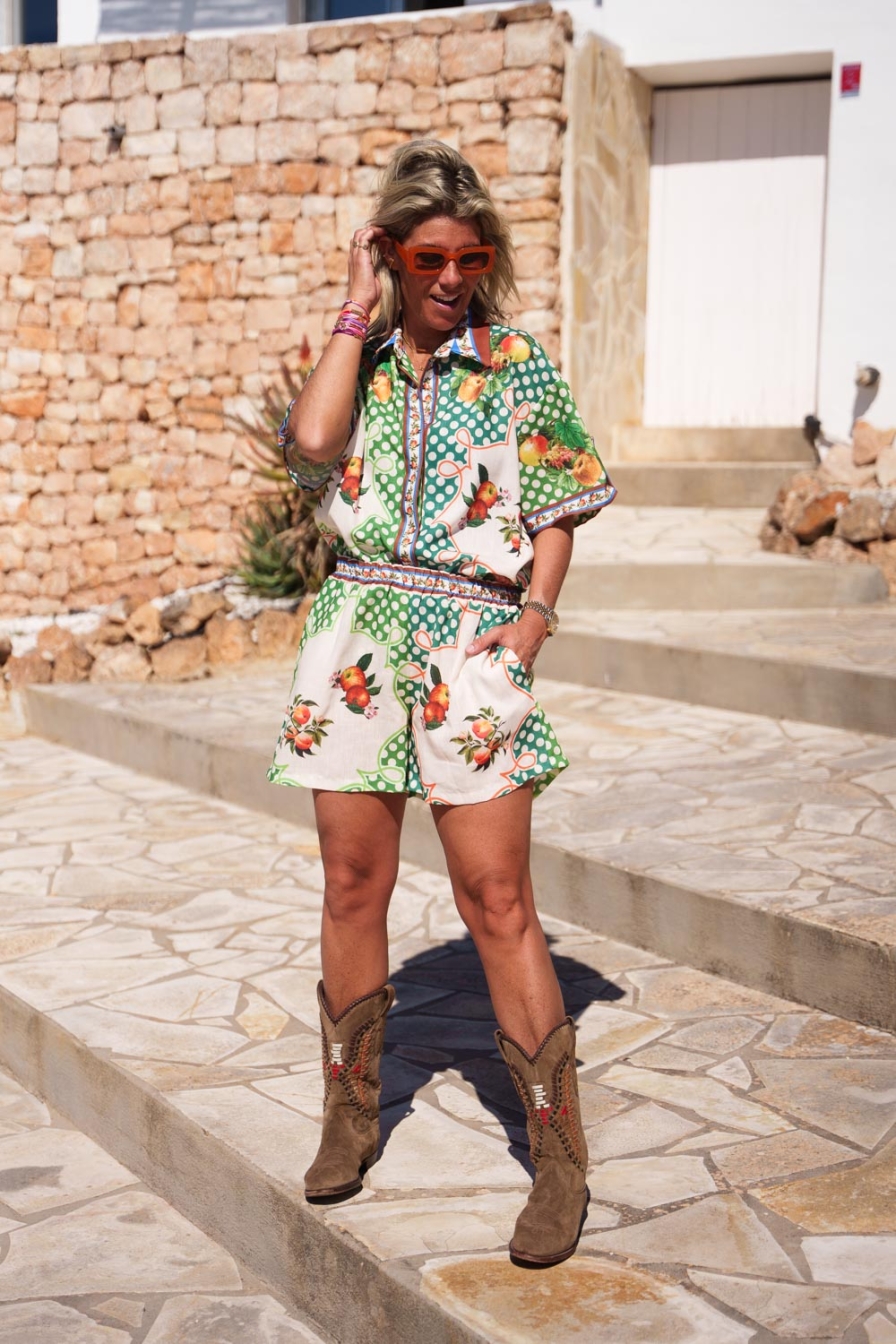 "Met deze luchtige Co-ord set ben je in één keer klaar voor de zomer! De set bestaat uit een blouse en broek in dezelfde print. Het onesize model is draagbaar van maat S tot en met XL en is heerlijk luchtig. De broek heeft een comfortabele elastische tailleband."