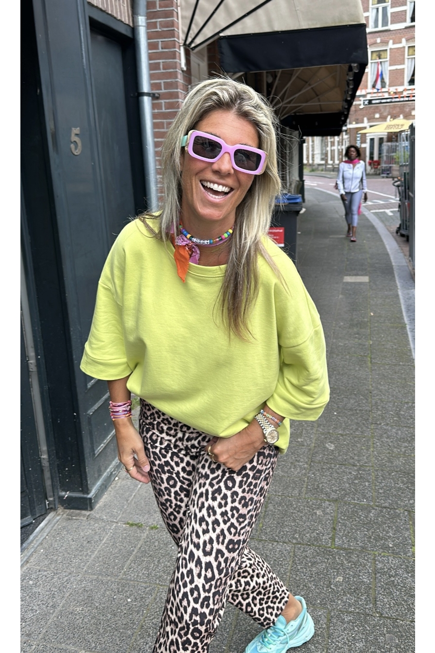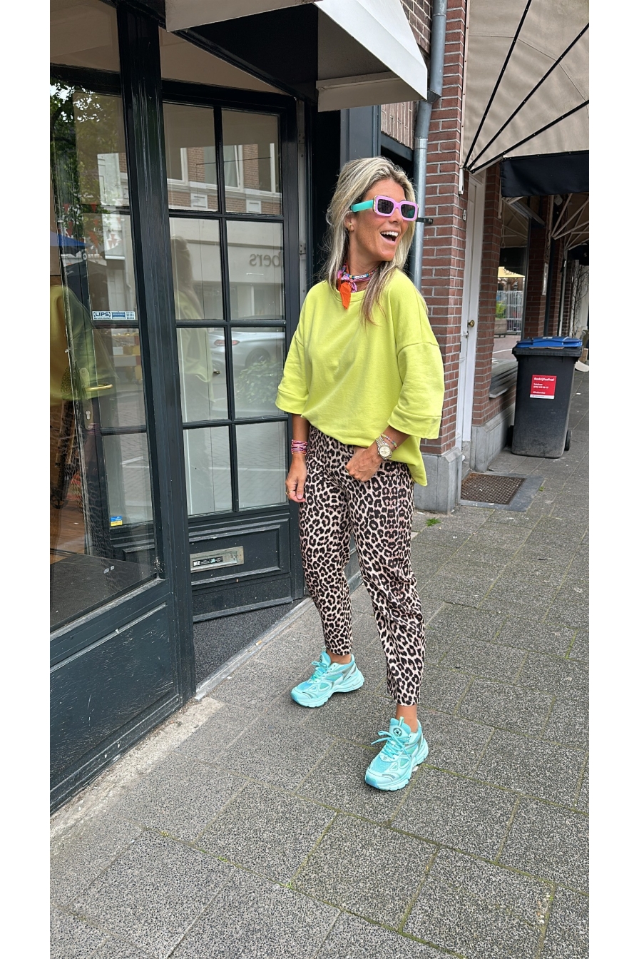 Combi set Xabi, gemaakt van 100% katoen,bestaat uit een oversized Onesize sweater met 3/4 mouw en een bijpassend joggingbroekje, verkrijgbaar in maat S/M of L/XL. Met mijn lengte van 1,76 m draag ik maat S/M.