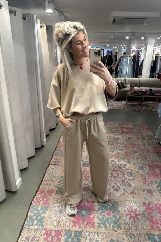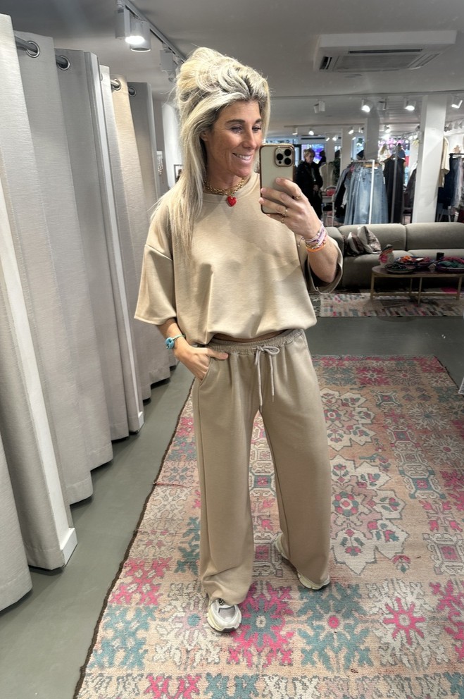 Heerlijk comfy pak bestaande uit een pantalon en bijpassende top. Het model valt lekker lang en de top heeft een stevige elastische band aan de onderkant, waardoor hij mooi aansluit en je hem makkelijk wat cropped kunt dragen als je dat wilt. Gemaakt van een fijne mix van 45% viscose, 50% polyester en 5% elastaan, wat zorgt voor een comfortabele fit met lekker veel stretch, draagbaar tm maat XL/44. De complete set shop je nu voor slechts €39,95.