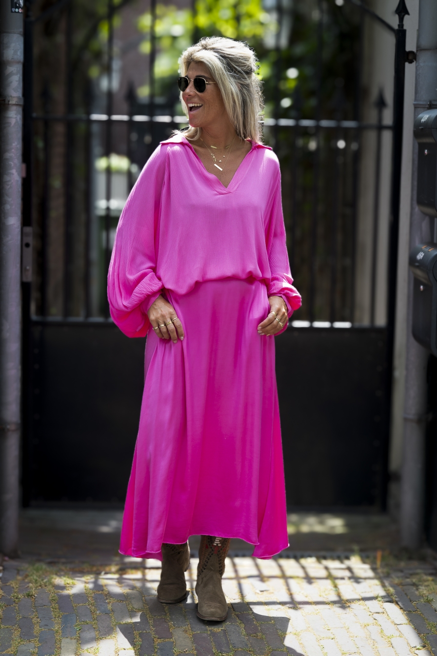 De blouse is 100% viscose – luchtig en zacht, met pofmouwen en een knoopje bij de pols voor een elegante touch.