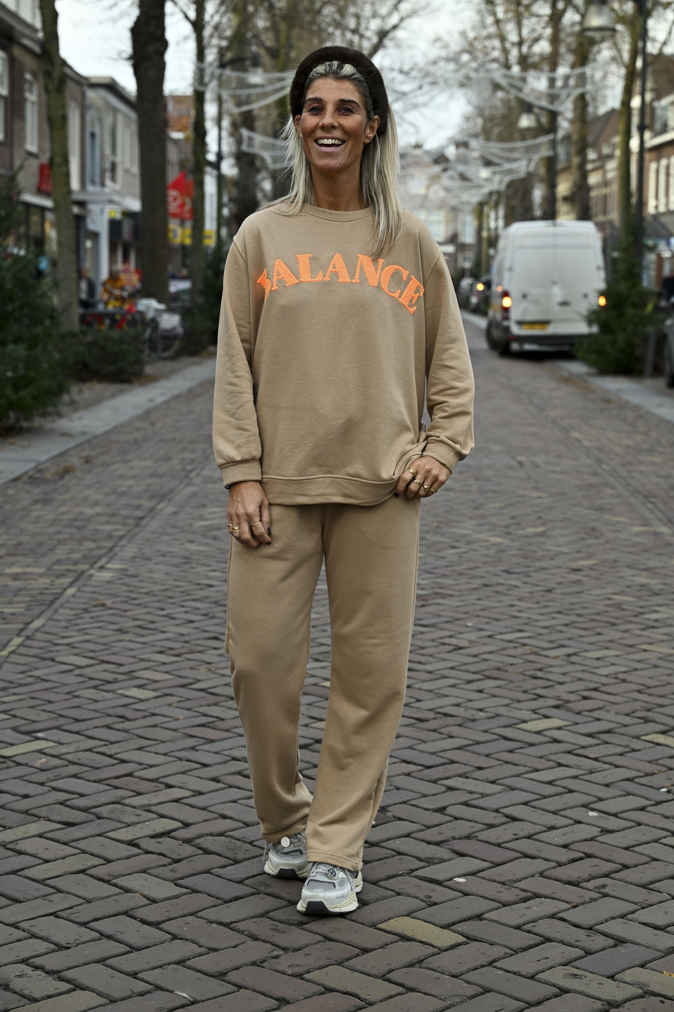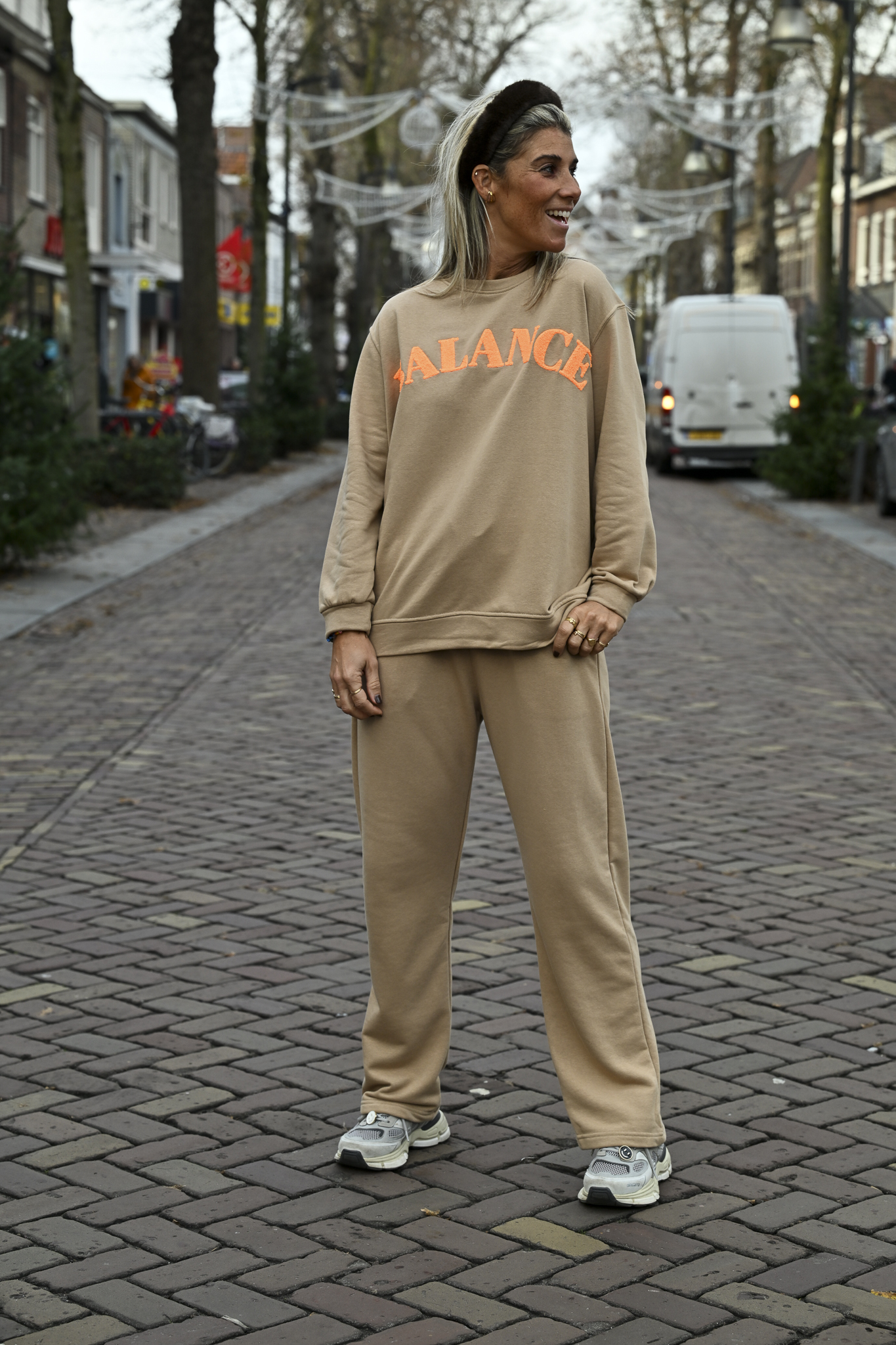 Heerlijk camel-kleurig combipak met een loose fit jogging en sweater. De set is afgewerkt met oranje gestikte letters “BALANCE”...