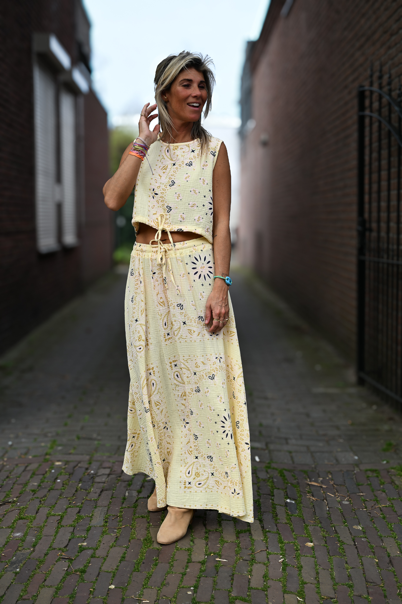 Heerlijke luchtige set (top en rok) van hydro stof. De rok heeft een elastische tailleband en aantrekkoord. De top heeft een knoopje in de nek zodat deze makkelijk aan en uit gaat. Dit onesize model draag je t/m maat L. Ik ben 1.76 lang, zo kun je goed inschatten hoe de set bij jou valt.