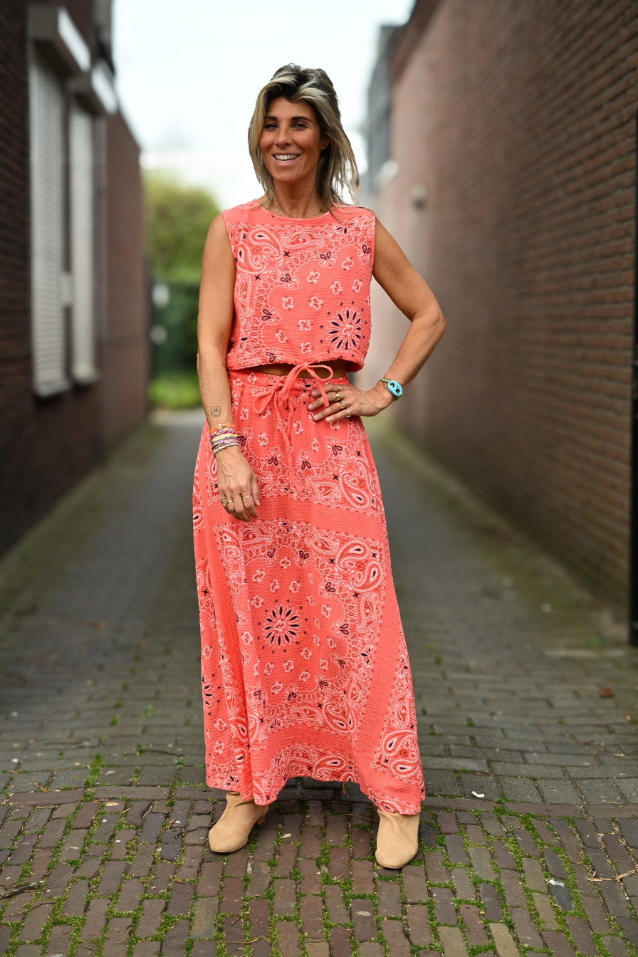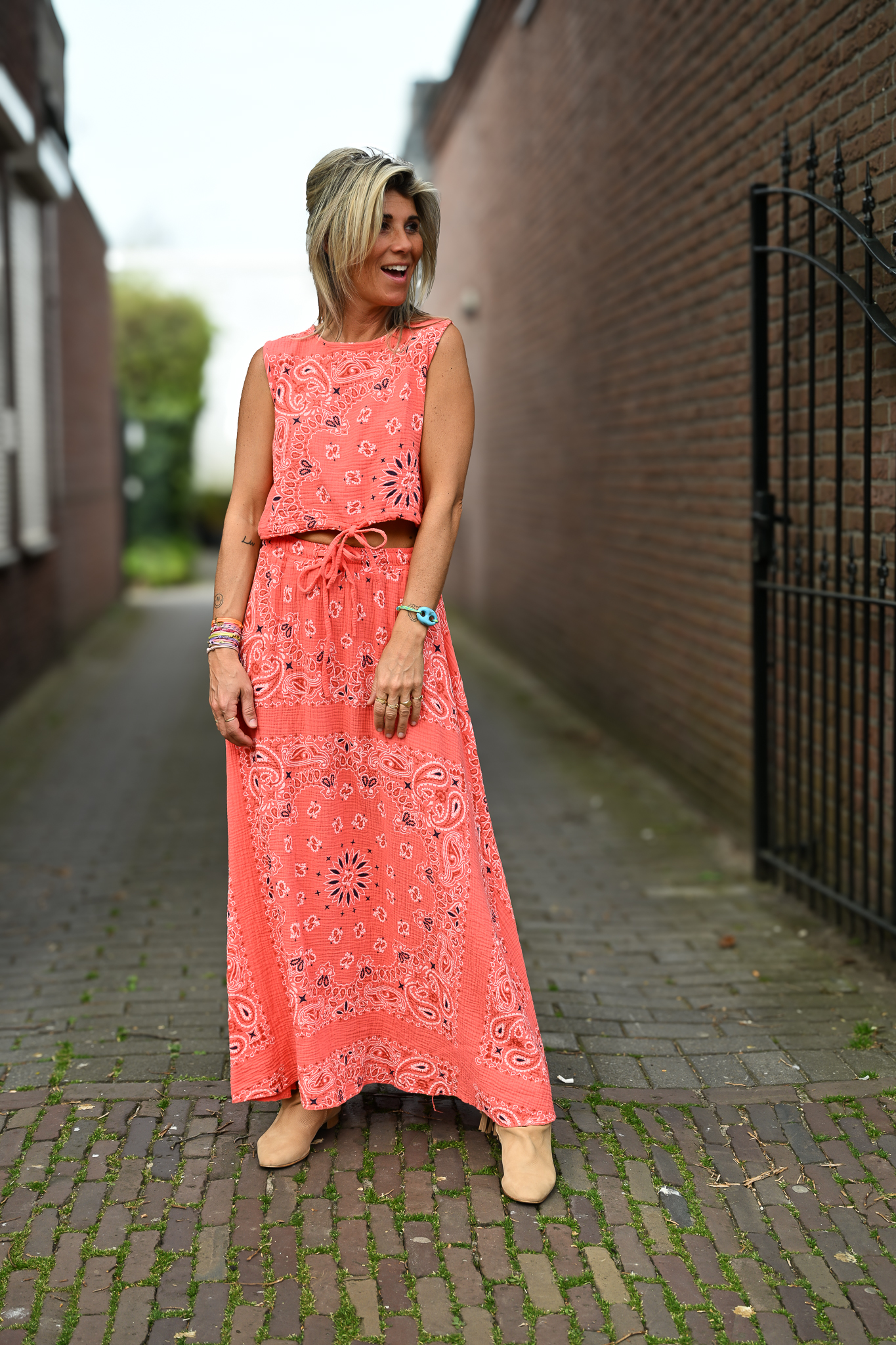 Heerlijke luchtige set (top en rok) van hydro stof. De rok heeft een elastische tailleband en aantrekkoord. De top heeft een knoopje in de nek zodat deze makkelijk aan en uit gaat. Dit onesize model draag je t/m maat L. Ik ben 1.76 lang, zo kun je goed inschatten hoe de set bij jou valt.