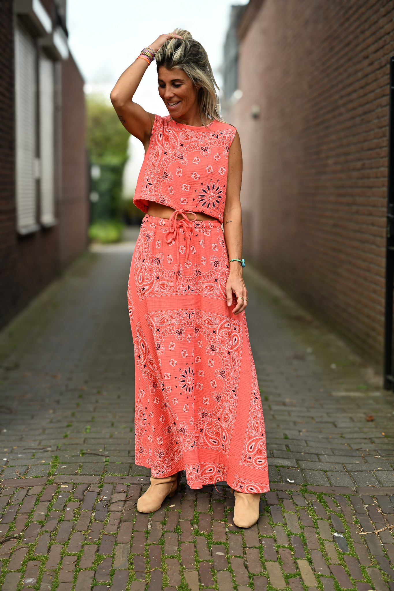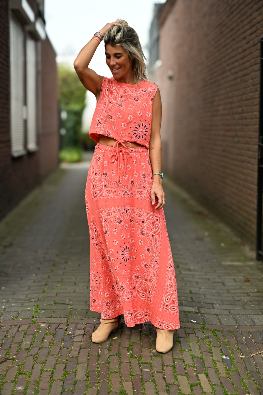 Heerlijke luchtige set (top en rok) van hydro stof. De rok heeft een elastische tailleband en aantrekkoord. De top heeft een knoopje...