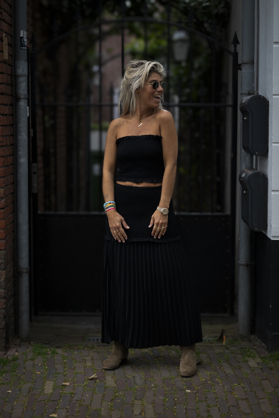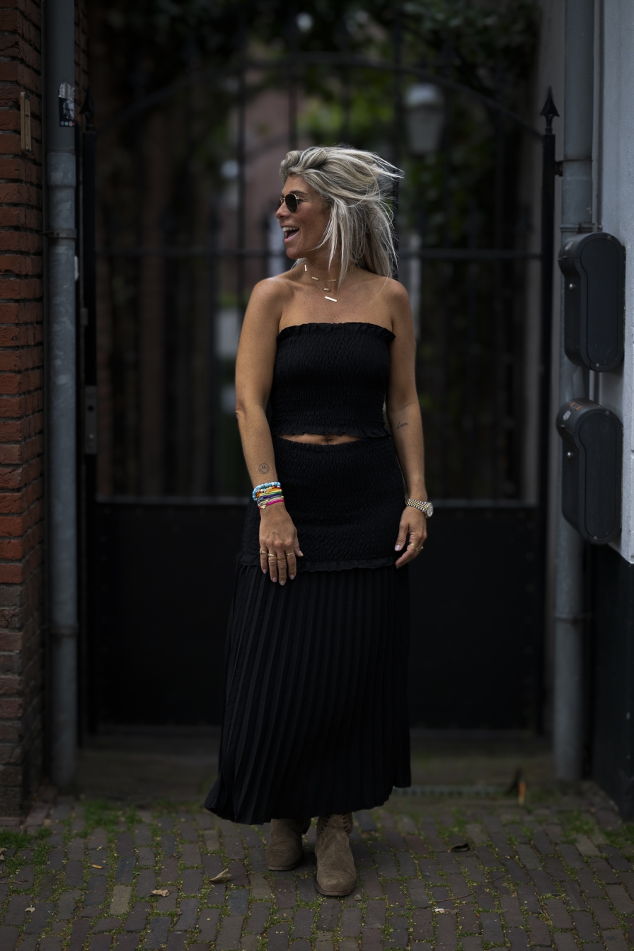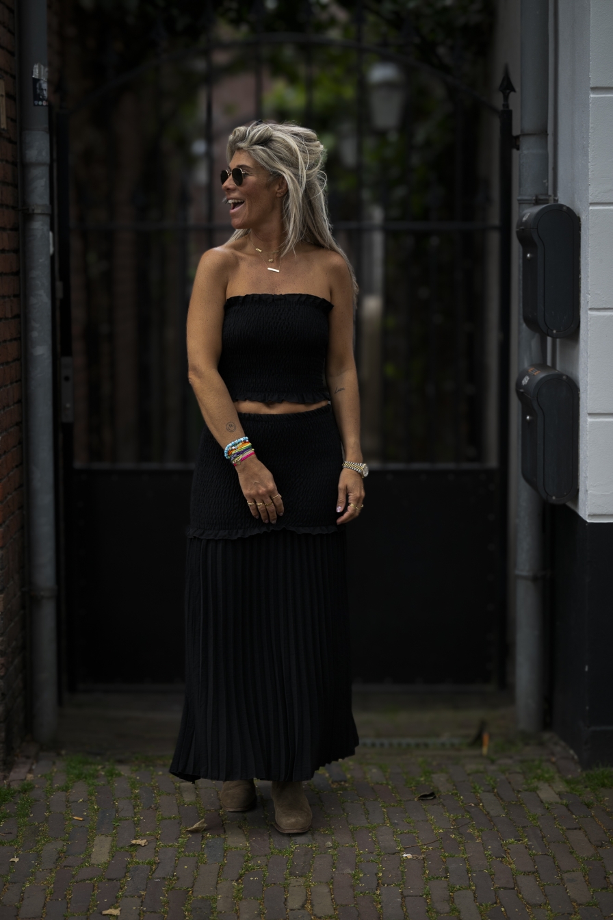 Combi-Set Laura bestaat uit een stretchy top en een plice rok met brede compleet elastische tailleband. Draag ze strak op elkaar of laat net een beetje buik zien voor die summer vibe. Door de volledige stretch in zowel top als rok draag je deze ONESIZE ITEMS makkelijk van maat XS t/m L