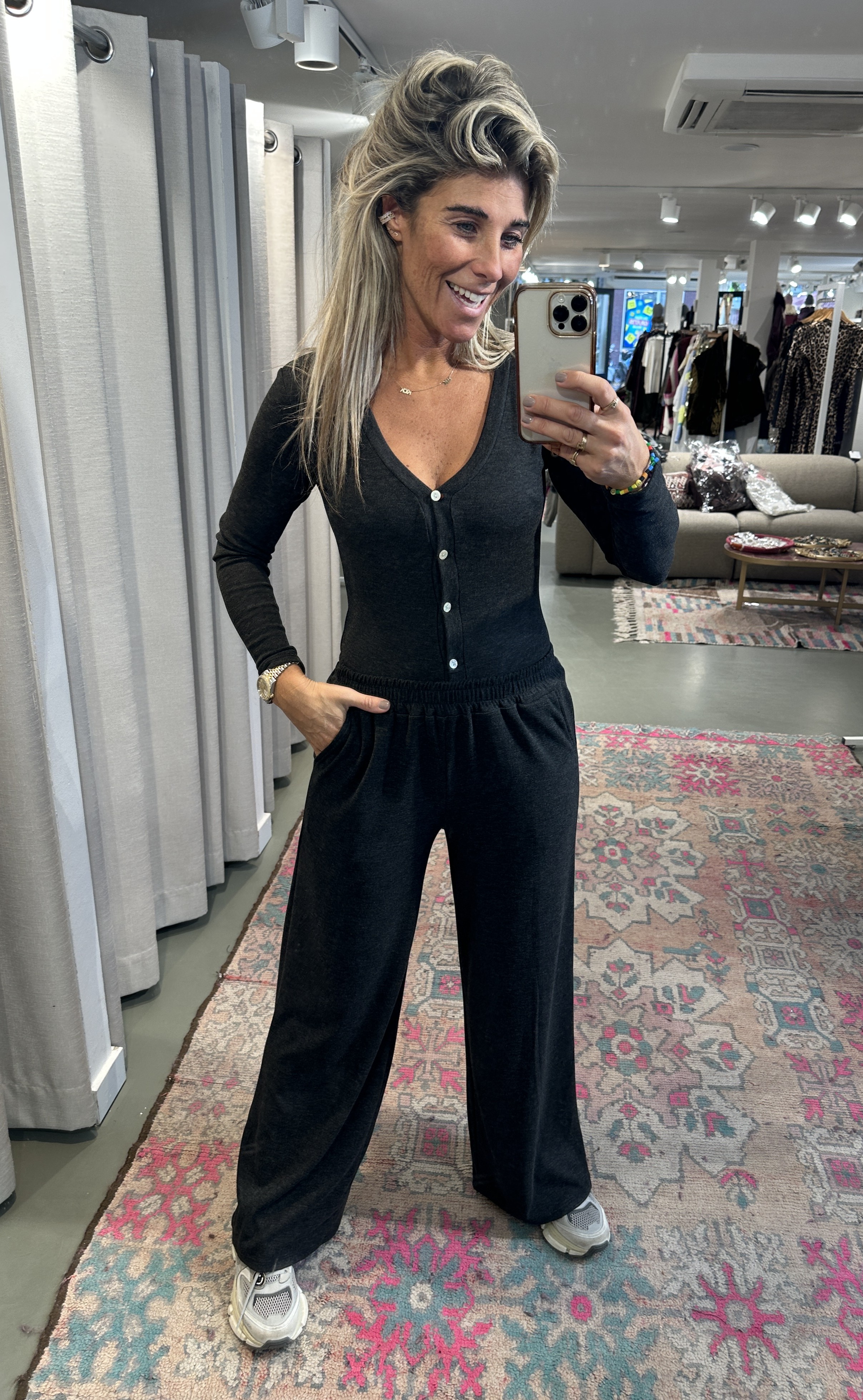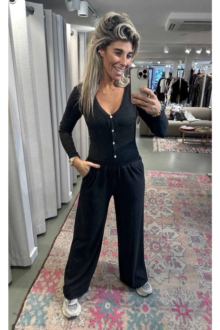 What can I say more! Dit heerlijke pak is gewoon THE BOMB! De wide-leg stretchy pantalon met steekzakken en stiekband zit als een droom. Maar wat ‘m écht next level maakt? De bijpassende body met knoopjes, lange mouwen, V-hals én verstelbare kruissluiting (3 lengtes). Onesize model, draagbaar tot maat L/XL.