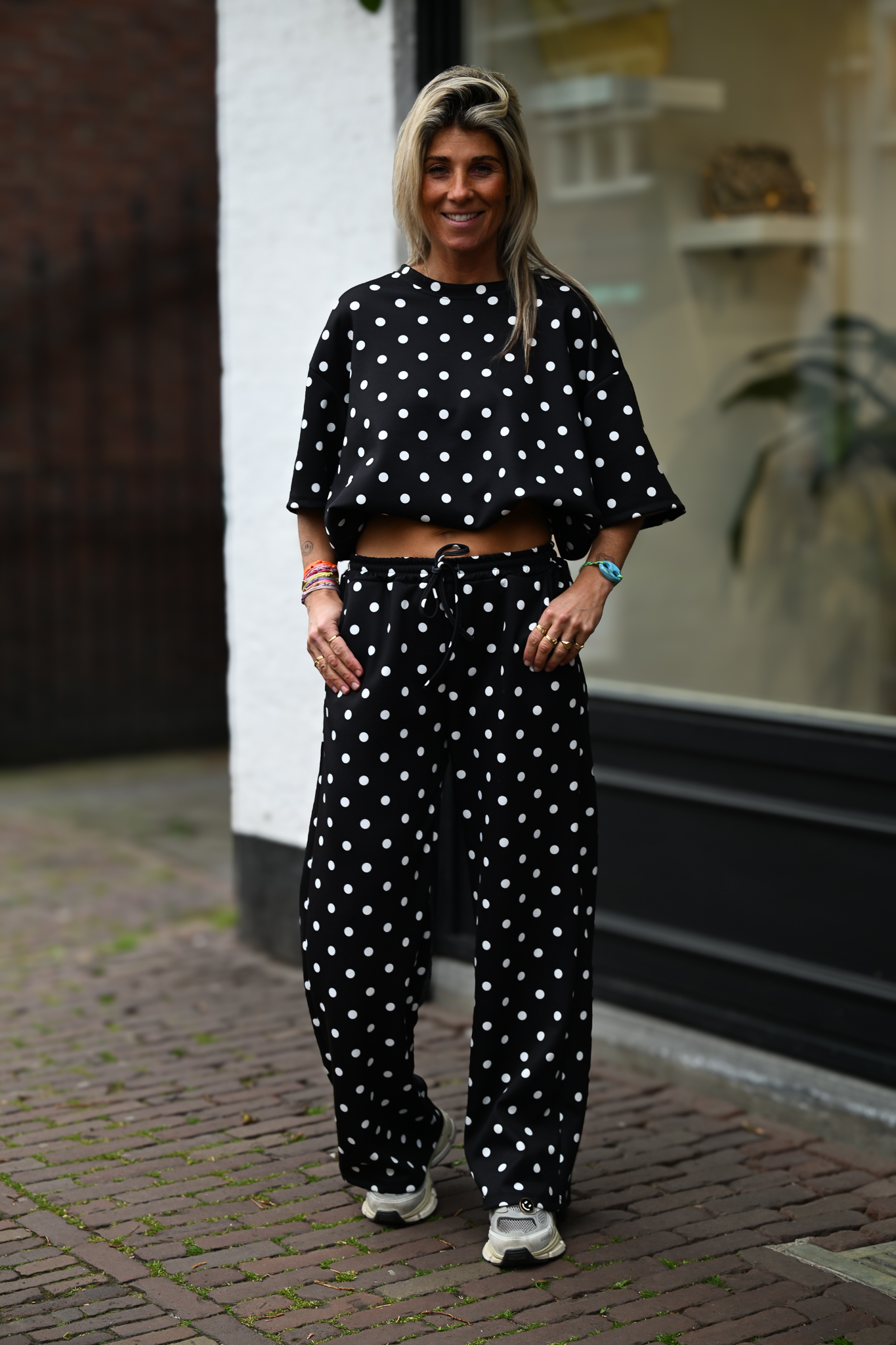 Heerlijk comfy pak met spots bestaande uit een pantalon en bijpassende top. Het model valt lekker lang en de top heeft een stevige elastische band aan de onderkant, waardoor hij mooi aansluit en je hem makkelijk wat cropped kunt dragen als je dat wilt. Gemaakt van een fijne mix van 45% viscose, 50% polyester en 5% elastaan, wat zorgt voor een comfortabele fit met lekker veel stretch, draagbaar tm maat L/XL. De complete set shop je nu voor slechts €49,95.