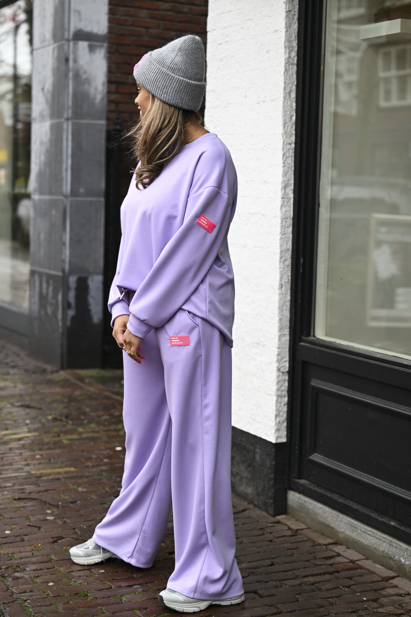 Combiset Suzy – dé knaller van januari! Straight leg broek met aantrekkoord en elastische taille, sweater met ronde hals en aansluitende polsen. Fuchsia detail op de linker mouw: “Dress for yourself”. Onesize, draagbaar tot maat L/XL, gemaakt van viscose/polyester mix.