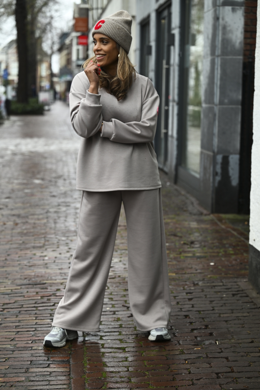 Combiset Suzy – dé knaller van januari! Straight leg broek met aantrekkoord en elastische taille, sweater met ronde hals en aansluitende...
