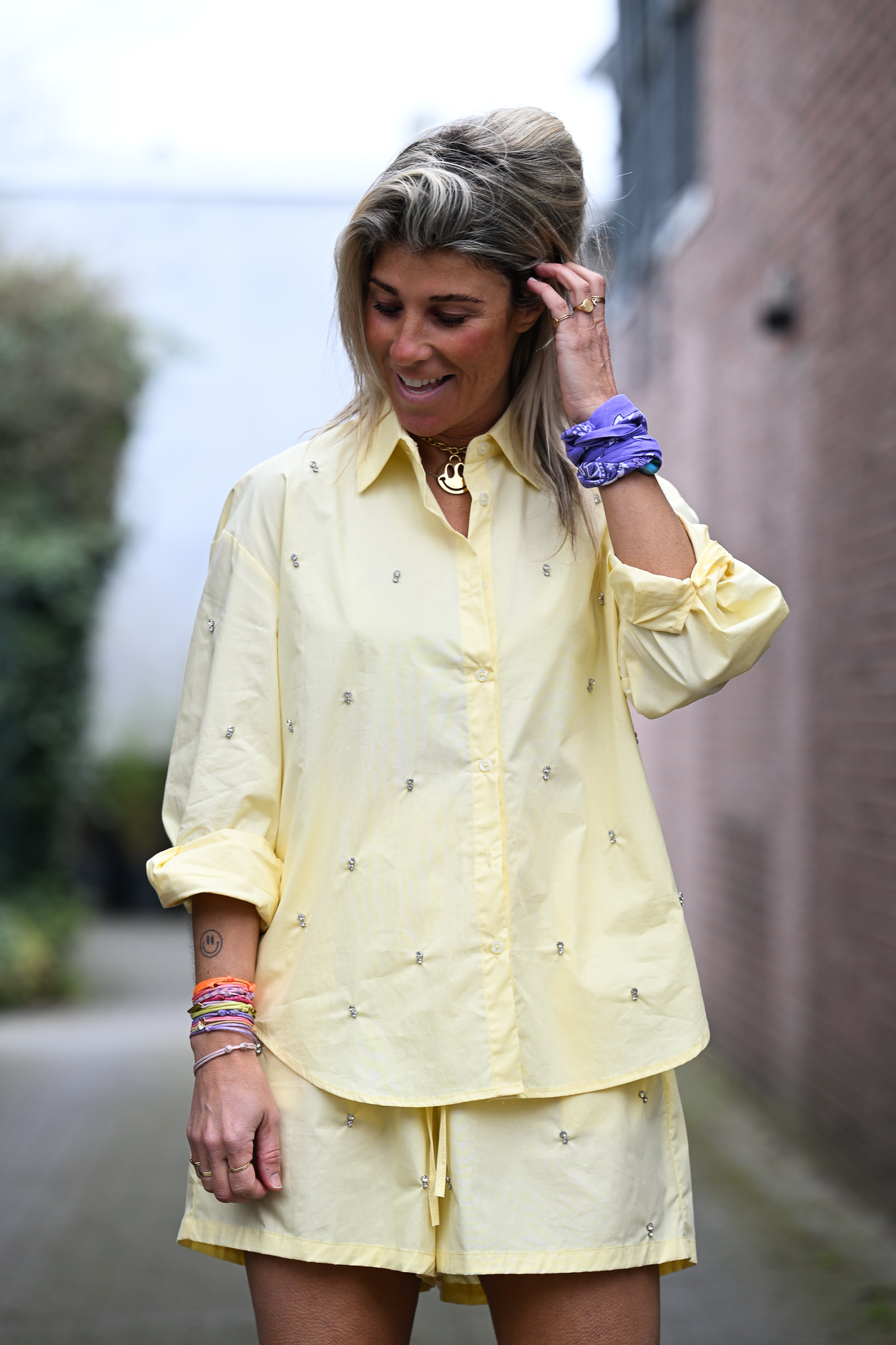Deze 100% katoenen co-ord set is een echte eyecatcher! Zowel het broekje als de blouse zijn versierd met sprankelende steentjes. Het broekje heeft een stretchy tailleband met aantrekkoord voor een perfecte pasvorm, en de blouse is aan de achterkant iets langer dan voor, waardoor hij mooi over de bil valt. Dit onesize setje past tot maat L/XL.