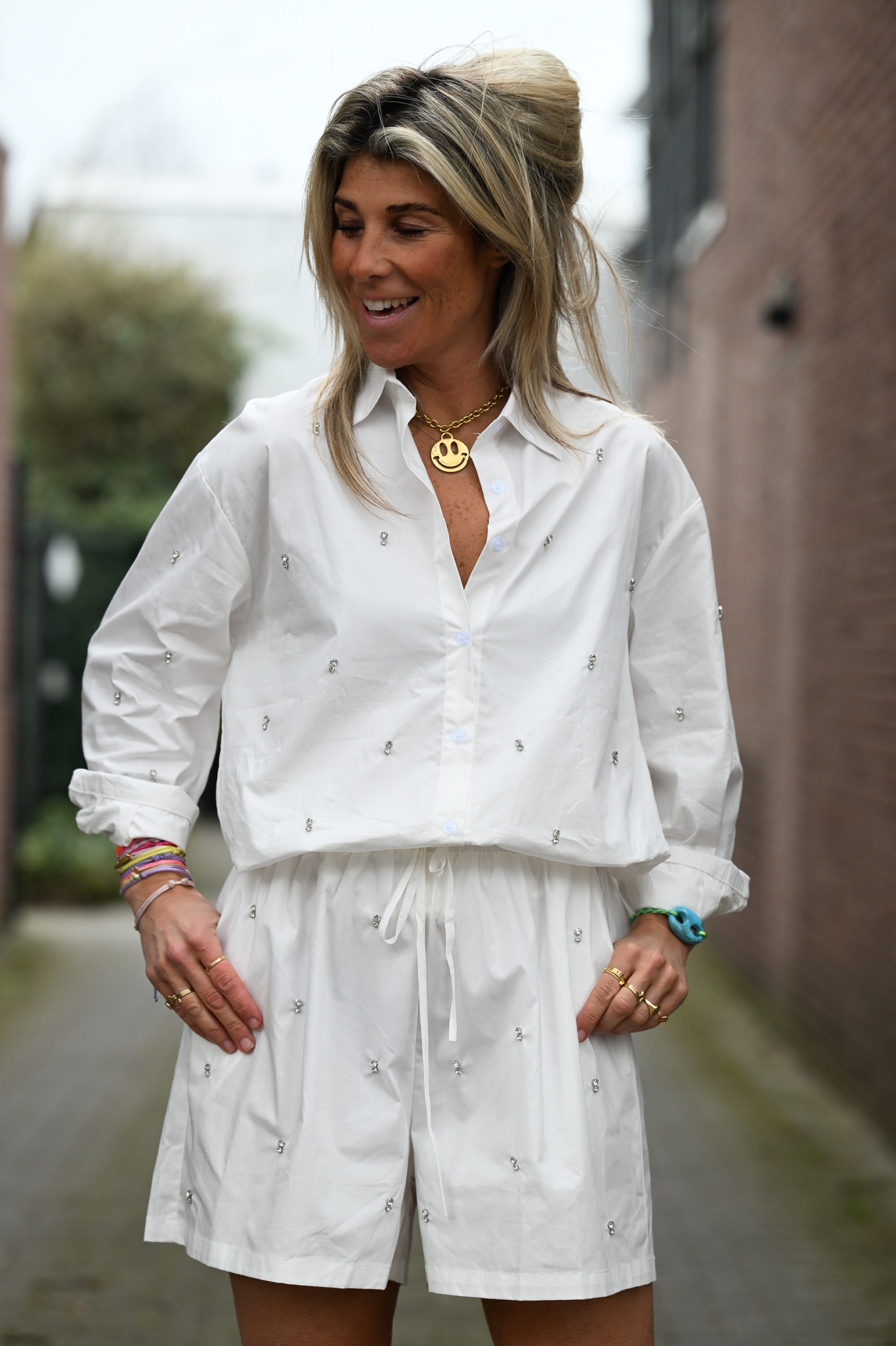 Deze 100% katoenen co-ord set is een echte eyecatcher! Zowel het broekje als de blouse zijn versierd met sprankelende steentjes. Het broekje heeft een stretchy tailleband met aantrekkoord voor een perfecte pasvorm, en de blouse is aan de achterkant iets langer dan voor, waardoor hij mooi over de bil valt. Dit onesize setje past tot maat L/XL.