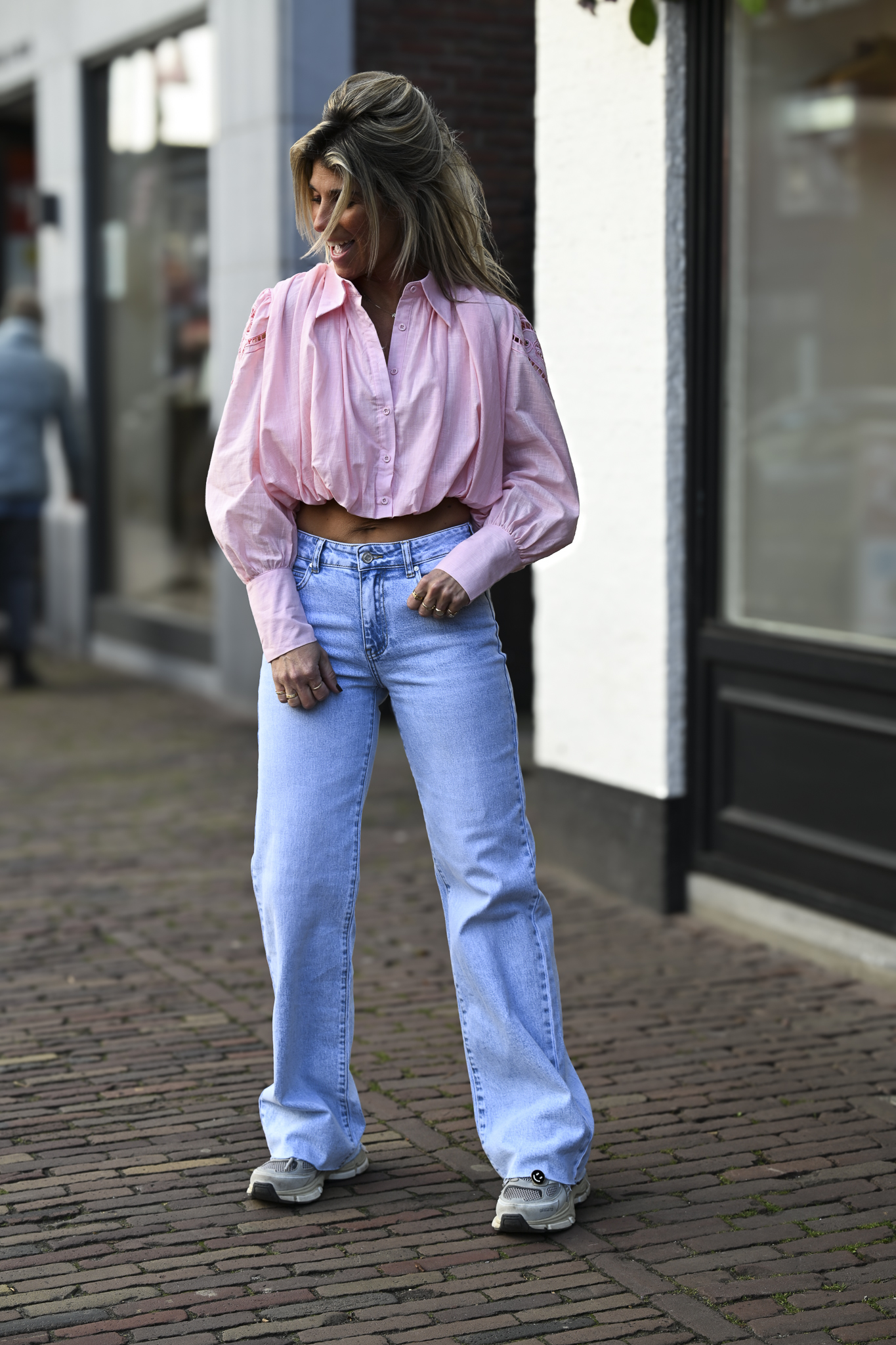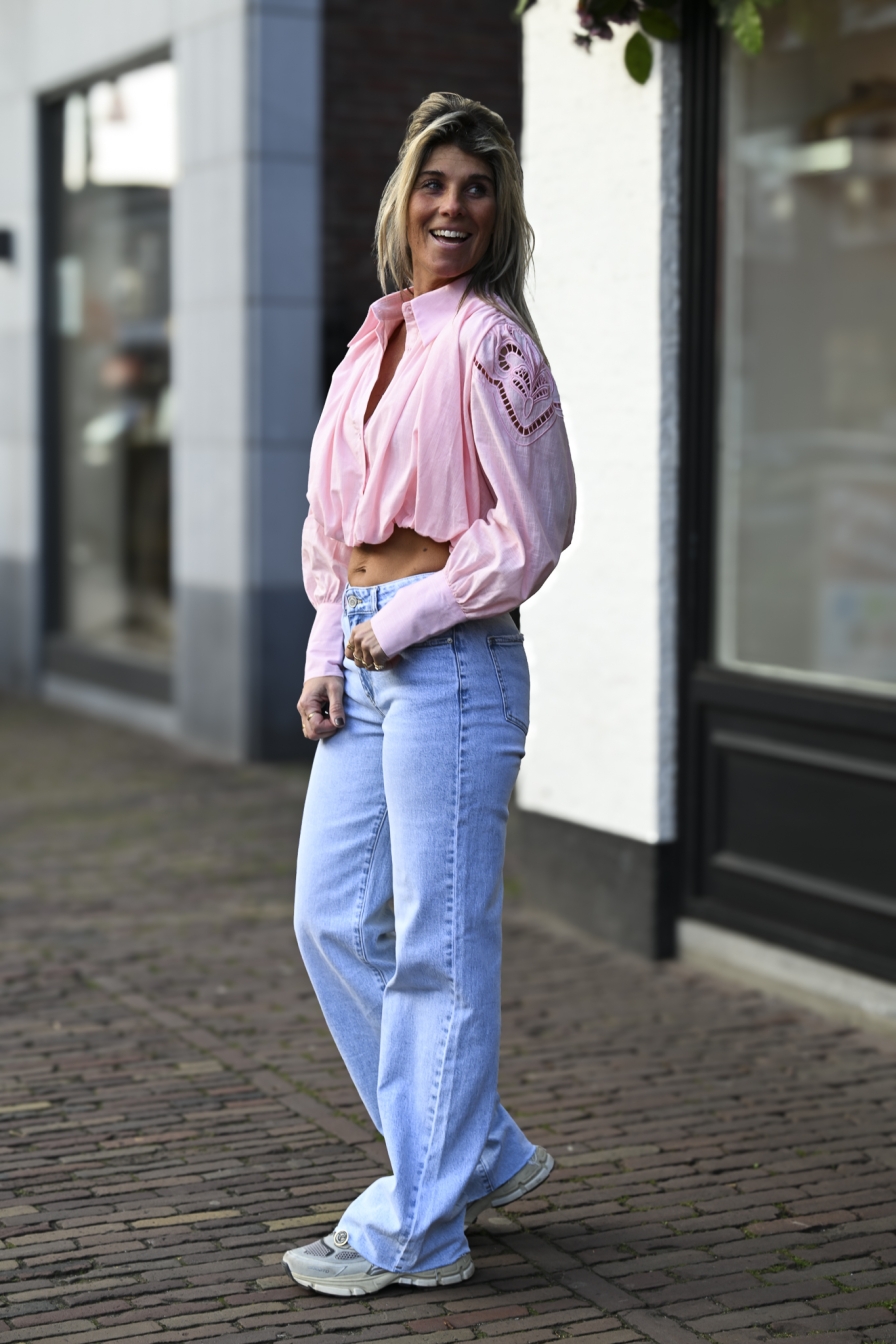 Cropped blouse met prachtige, licht doorschijnende broderie bloemetjes op de schouders. De knoopjes hebben een subtiele glamour touch en de heerlijke kropmouwen maken dit item extra vrouwelijk. Ik draag maat S/M op de foto.
