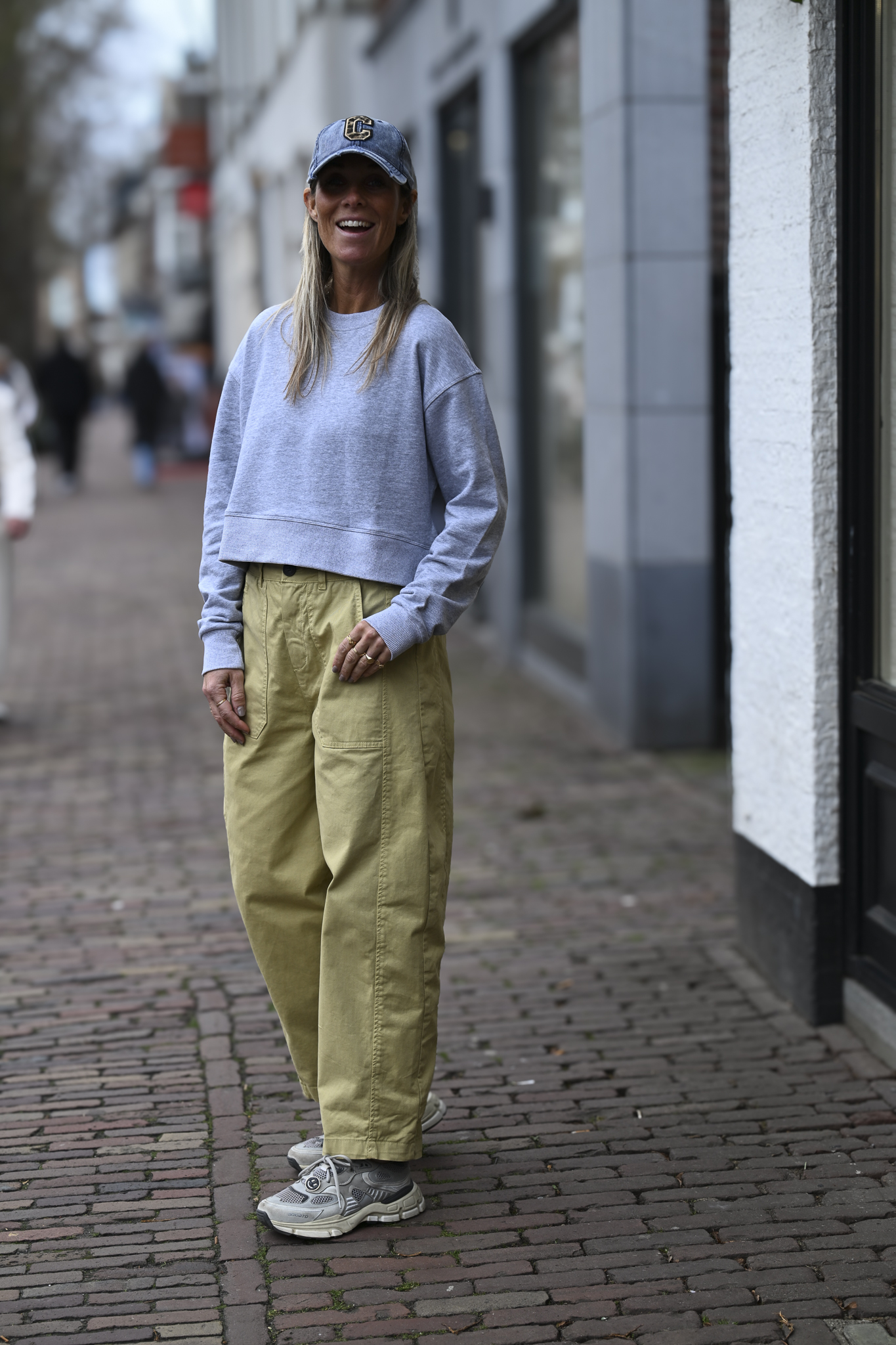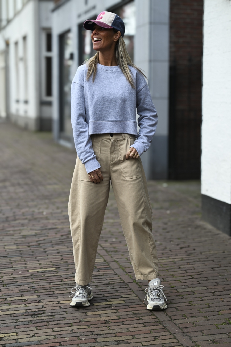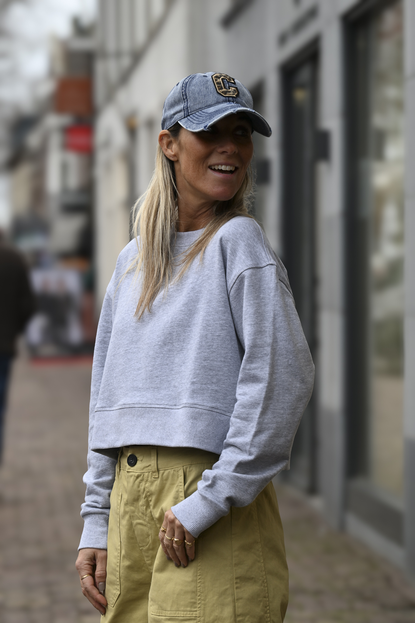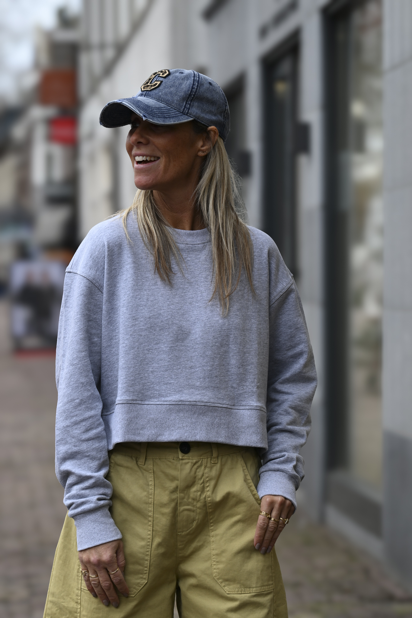 Deze cropped sweater, gemaakt van 100% katoen, heeft subtiele splitjes van 5 cm in de tailleboord. Op de foto draag ik maat S/M en ik ben 1.76 m.