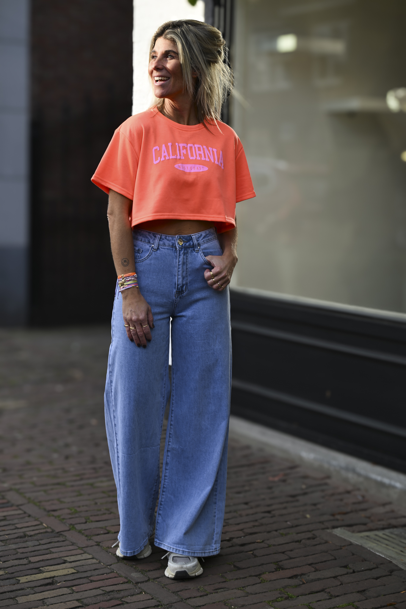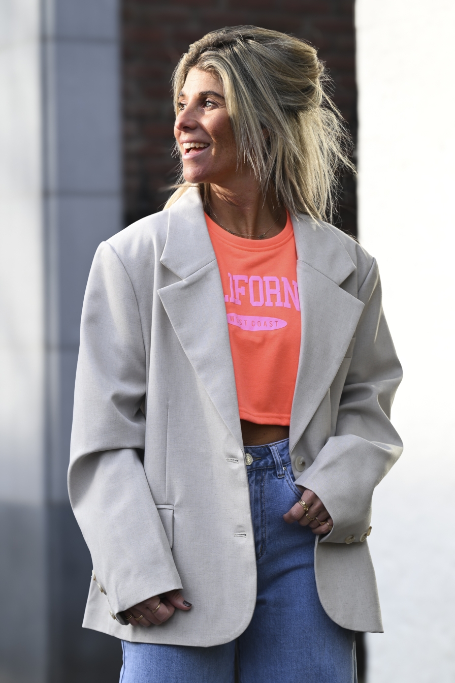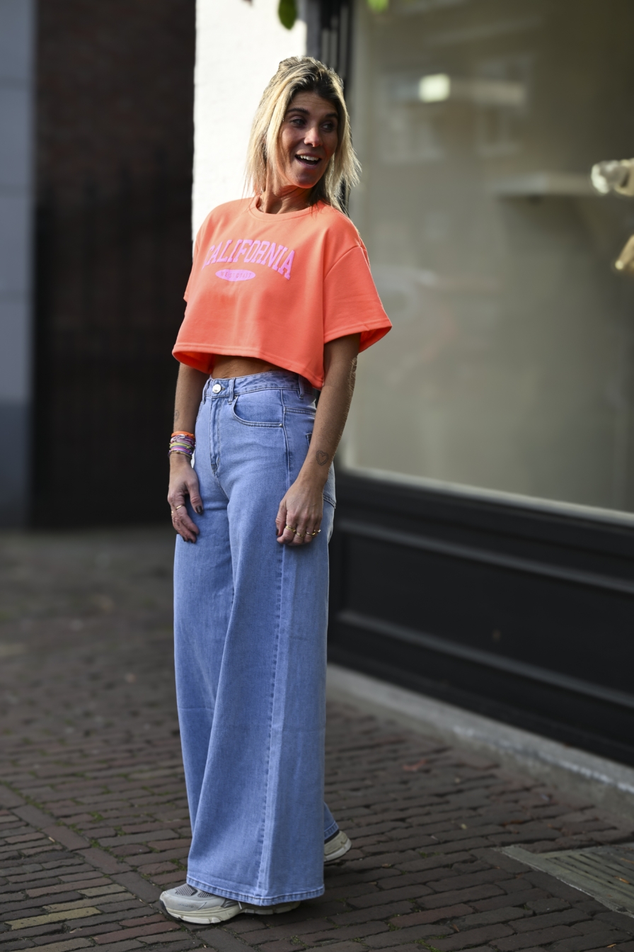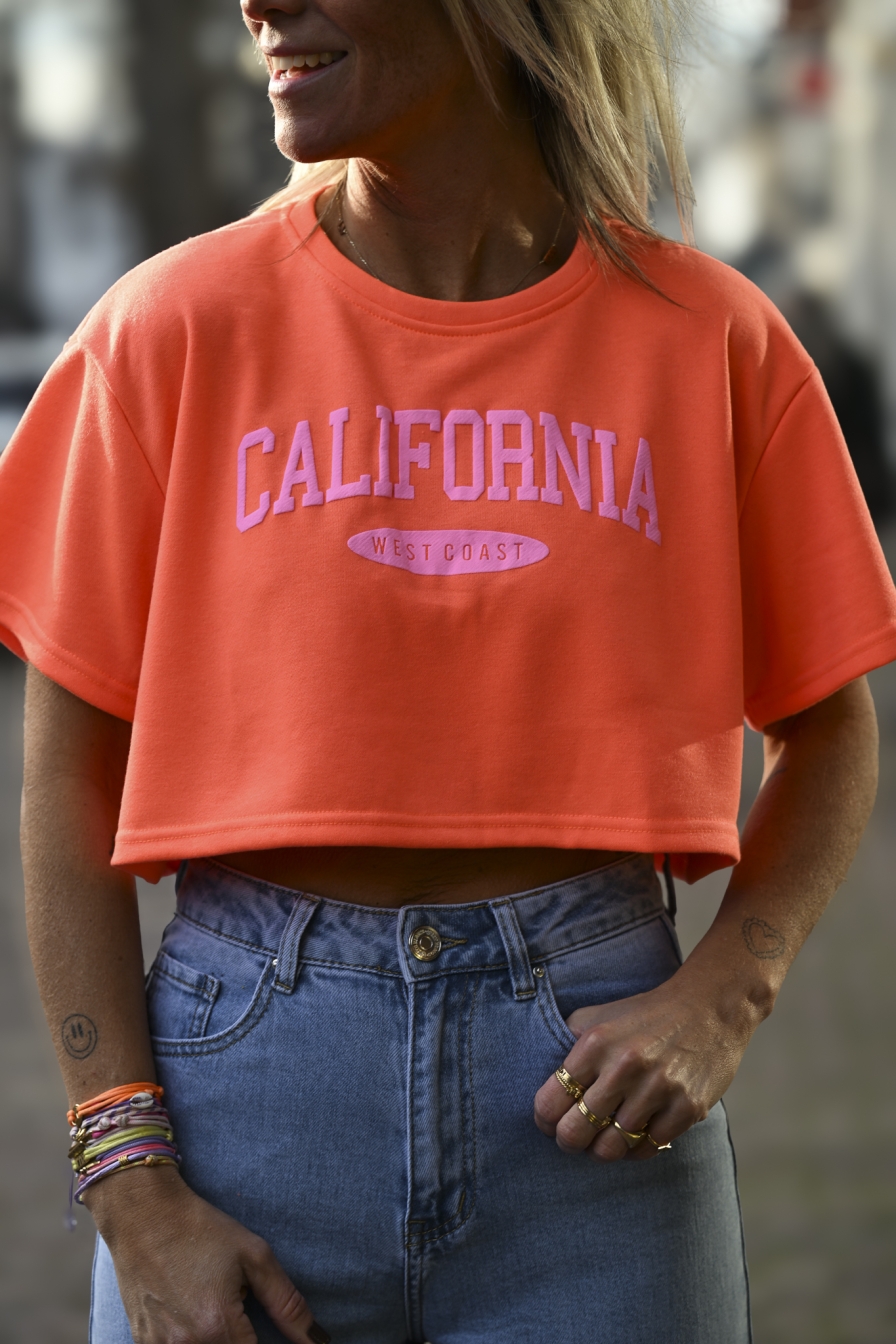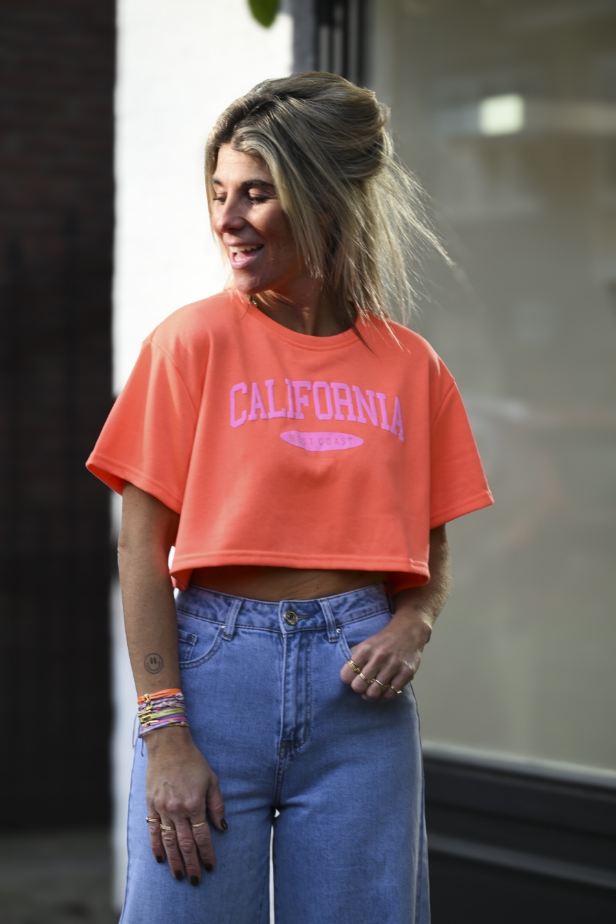 Cropped T-shirt CALIFORNIA West-Coast alert! Onesize in frisse kleuren. Het cropped model valt tot halverwege de buik, maar heeft wel een ruime fit. Draagbaar tot en met maat M/L