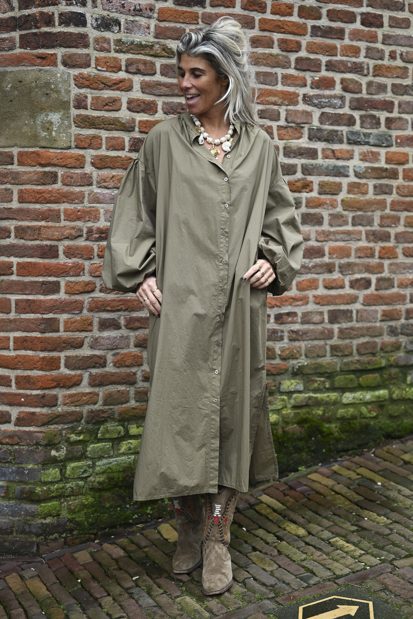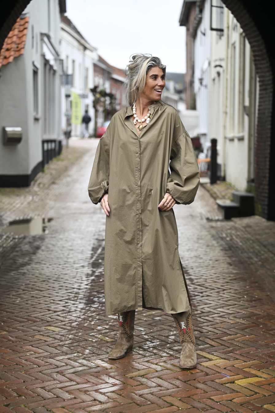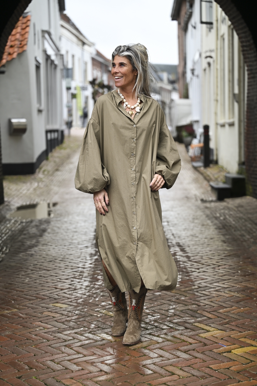 YESS, deze 100% katoenen dress heeft alles waar wij van houden! Mega pofmouwen met een elastische band om de pols, handige steekzakken en knopen van boven tot onder. Dit onesize loose fit model draag je tot en met maat XL/42.