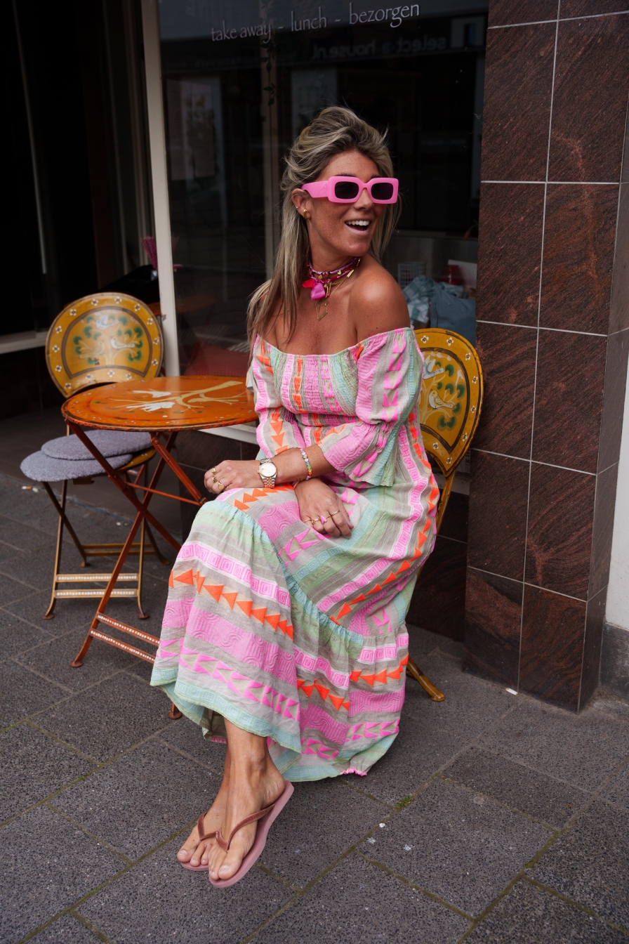 Ontdek de ultieme zomervibe met de Dress Boho Aztec Maxi! Gemaakt van 62% katoen, biedt deze jurk niet alleen comfort maar ook een trendy Boho Ibiza style print die je direct in vakantiestemming brengt. Het one size model met Eleastische borst heeft een speels kapmauwtje en past perfect tot maat XL/44.