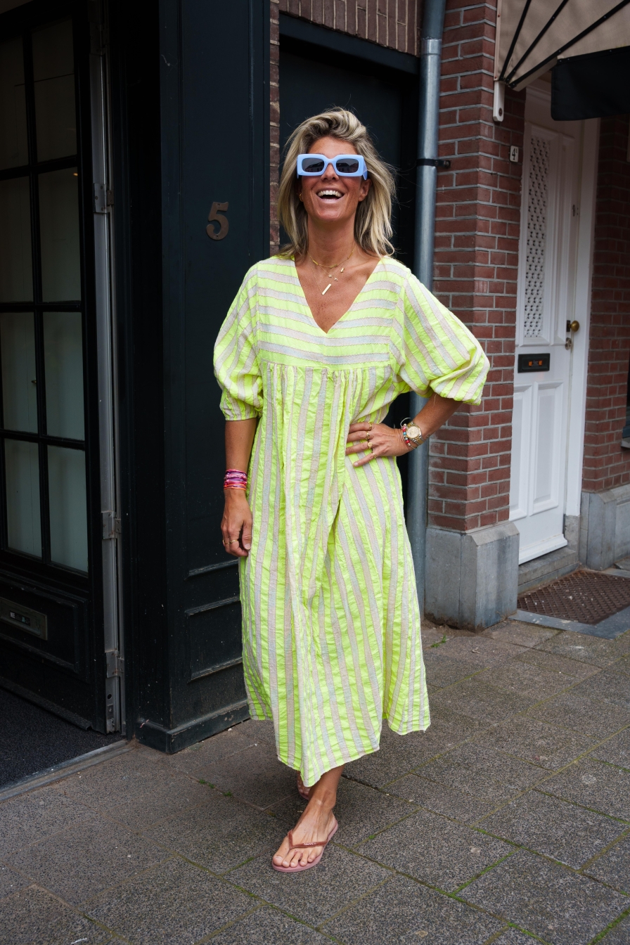 "Dress Estrella, dé zomerfavoriet! Gemaakt van 98% katoen voor een luchtig en comfortabel gevoel op warme dagen. Met zijn schattige pofmouwtjes en tijdloze design is deze jurk een must-have voor je zomergarderobe. Dit Onesize model draag je tot en met maat XL/44!
